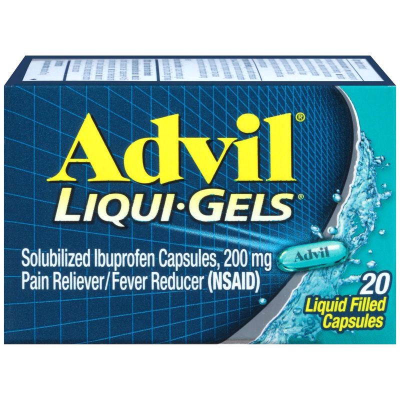 - • 20 Advil Liqui-Gels Pain Reliever and Fever Reducer liquid filled capsules, with ibuprofen 200 mg• Advil pain reliever and fever medicine for fast relief with packaging with 20% less plastic by 2022• Back and body pain medicine for muscle ache, menstrual pain, minor arthritis pain or headache relief• Designed for fast absorption• Minor arthritis pain reliever and headache medicine for adults and children 12 years and older• HSA and FSA eligible product