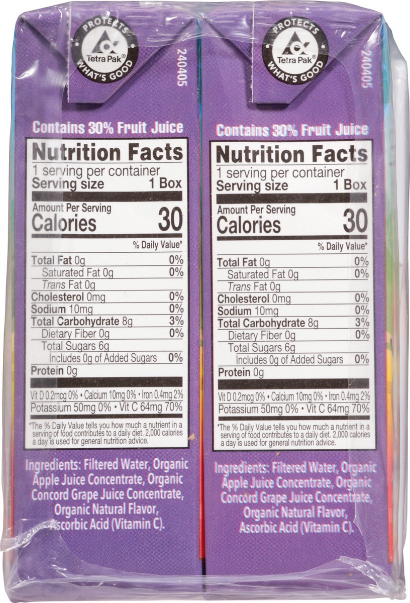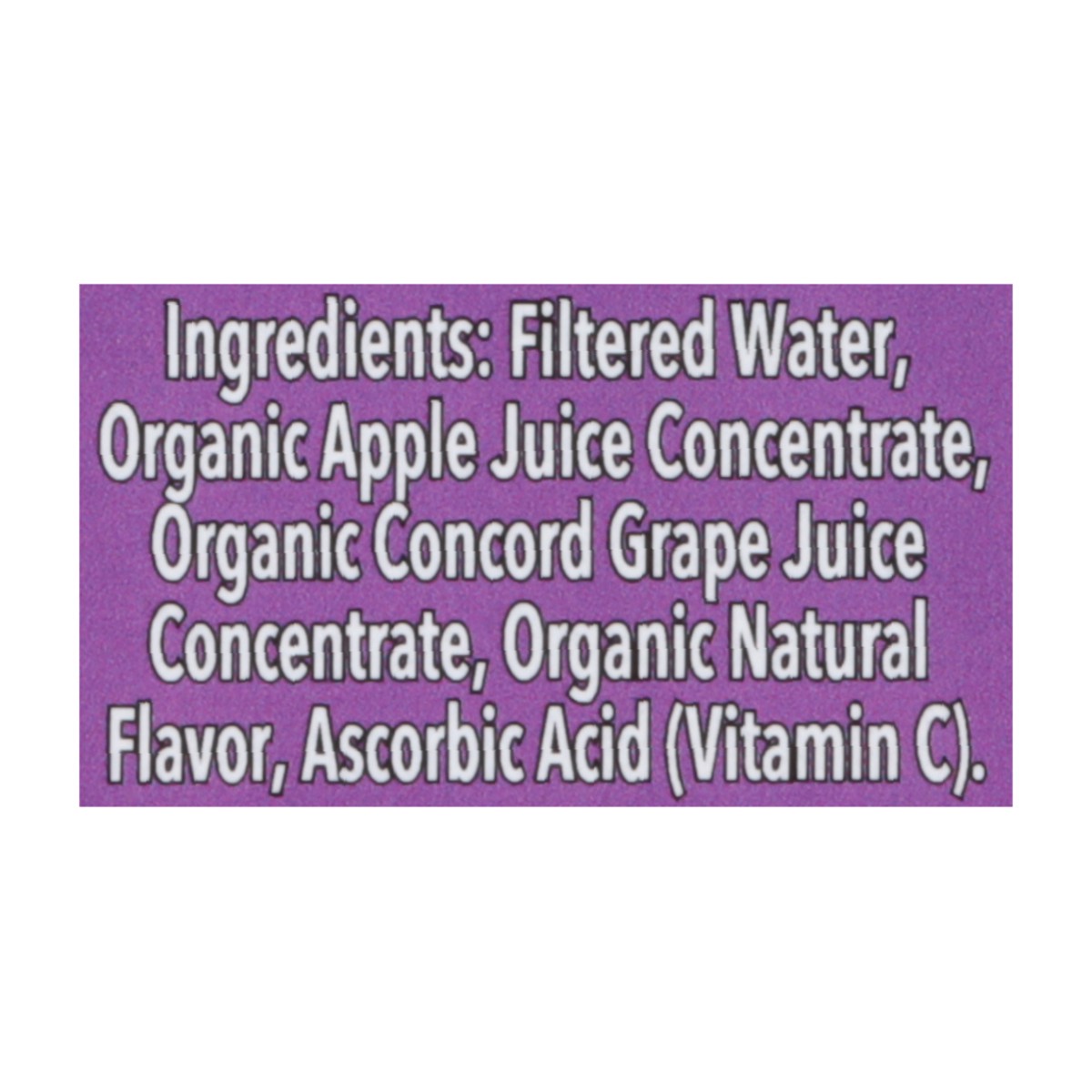 Filtered Water, Organic Apple Juice Concentrate, Organic Concord Grape Juice Concentrate, Organic Natural Flavor, Ascorbic Acid (Vitamin C).