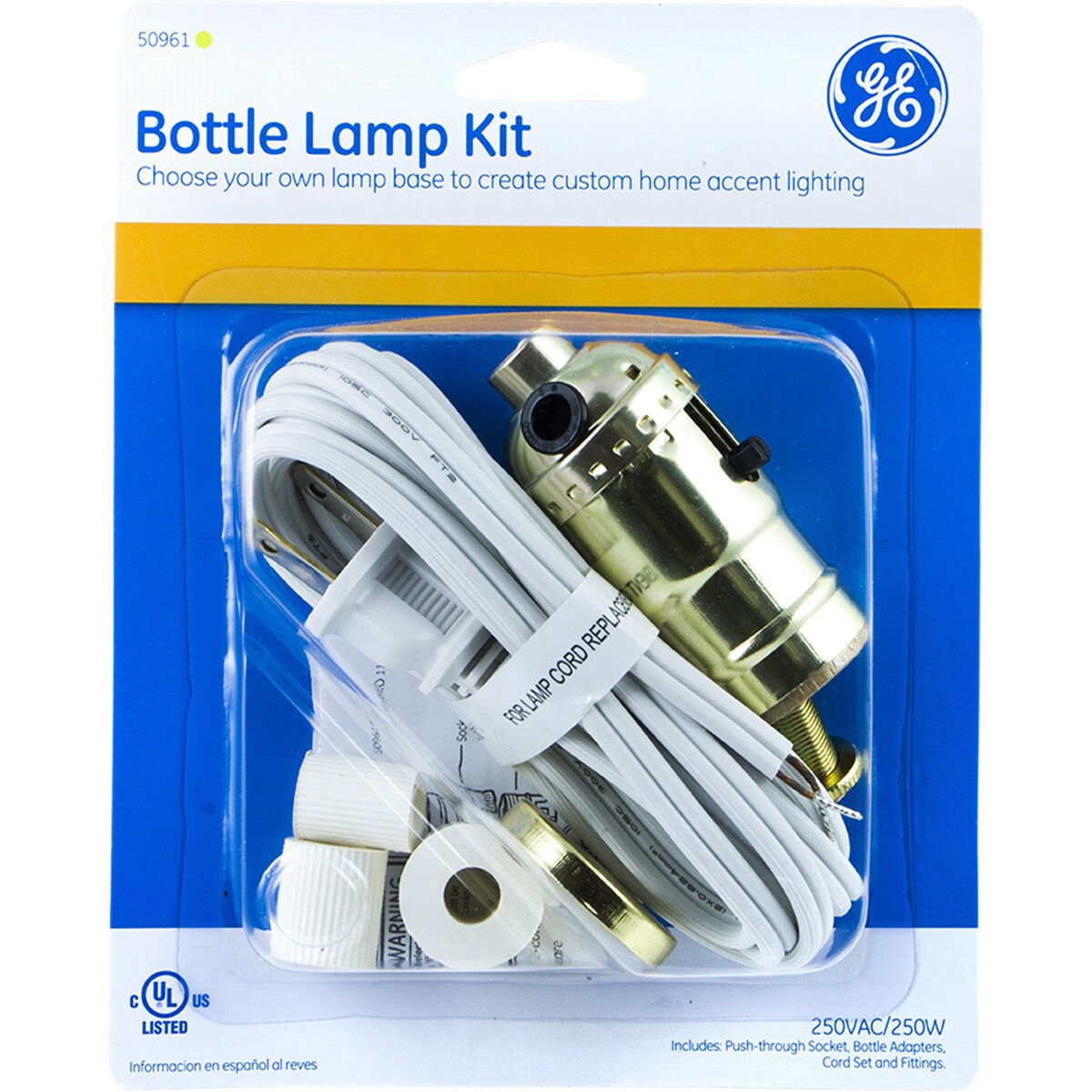 Complete your own lighting DIY project using the GE Bottle Lamp Kit. This kit allows you to choose your own lamp base to create custom home accent lighting. The kit contains everything you need to fin…