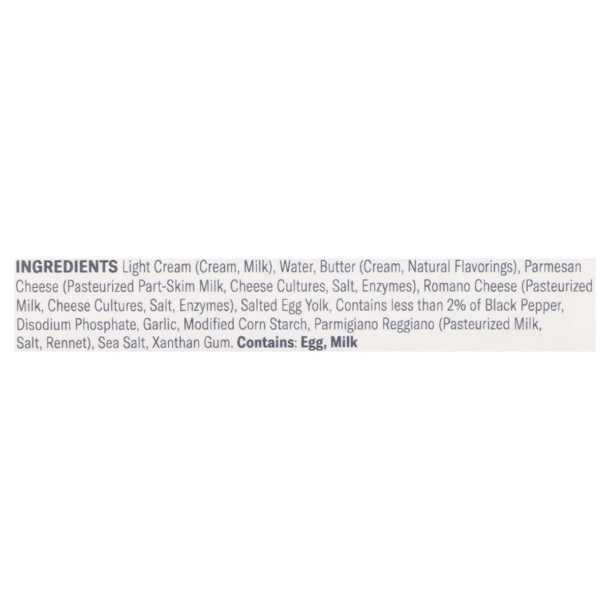 Light Cream (Cream, Milk), Water, Butter (Cream, Natural Flavorings), Parmesan Cheese (Pasteurized Part-Skim Milk, Cheese Cultures, Salt, Enzymes), Romano Cheese (Pasteurized Milk, Cheese Cultures, Sa…