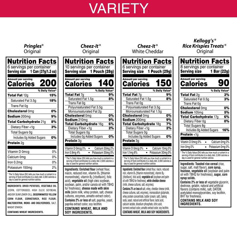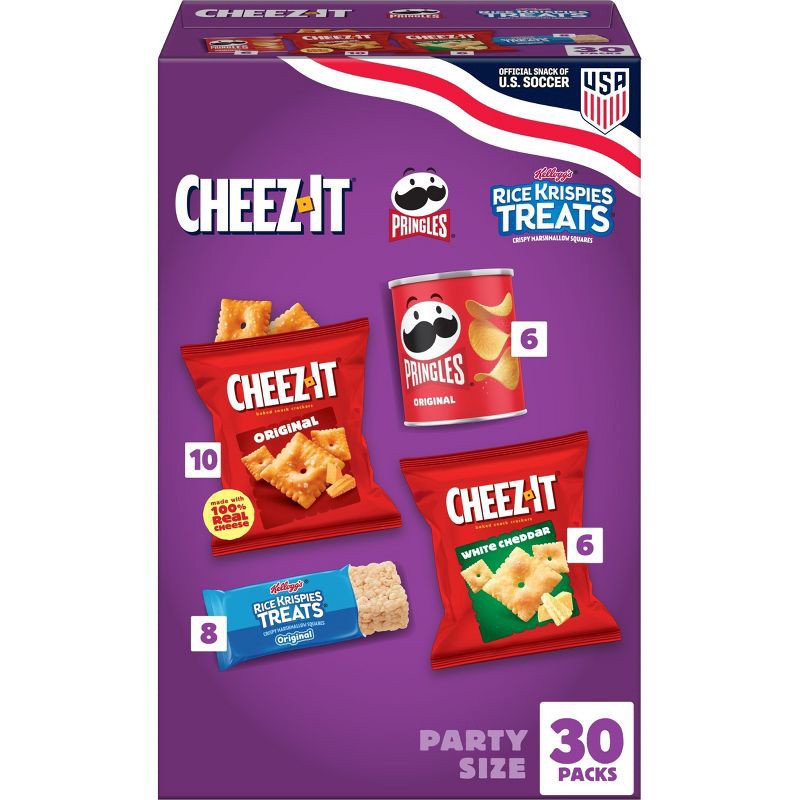 - Includes one 30.1oz box with 30 packs: 10 Cheez-It Original, 6 Cheez-It White Cheddar, 8 Rice Krispies Treats Original, 6 Pringles Original
