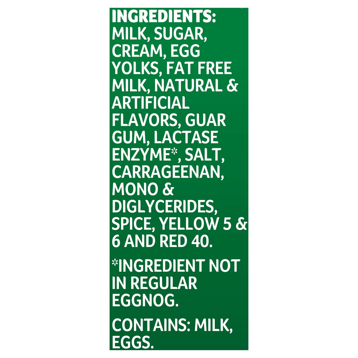 Milk, Sugar, Cream, Egg Yolks, Fat Free Milk, Natural & Artificial Flavors, Guar Gum, Lactase Enzyme*, Salt, Carrageenan, Mono & Diglycerides, Spice, Yellow 5 & 6 and Red 40. *Ingredient n…