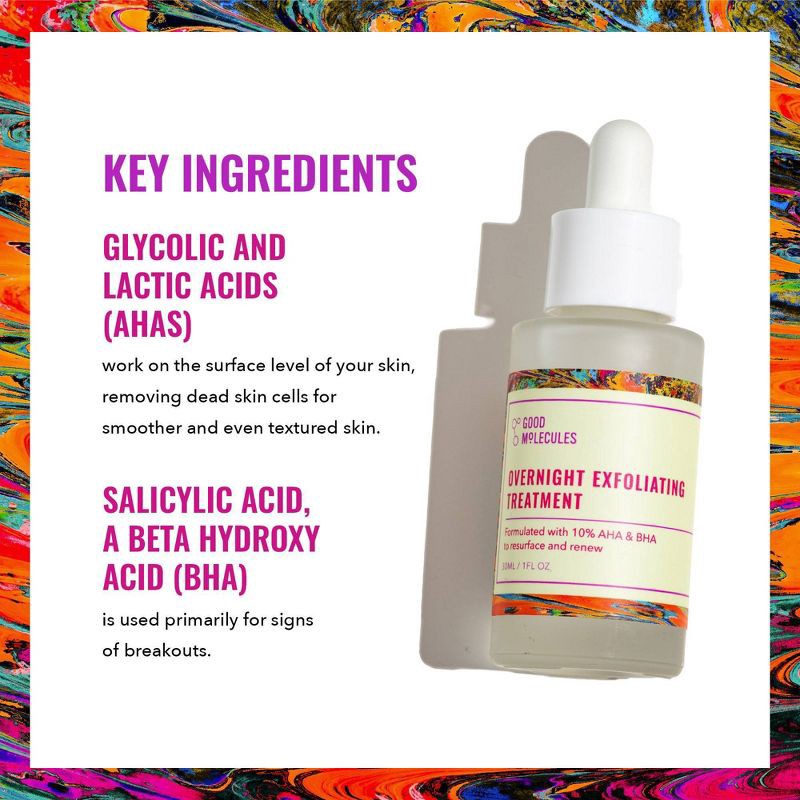 Wake up to a smoother, clearer complexion with Overnight Exfoliating Treatment from Good Molecules. This blend of 10% alpha and beta hydroxy acids helps to resurface and renew, smoothing away dead ski…