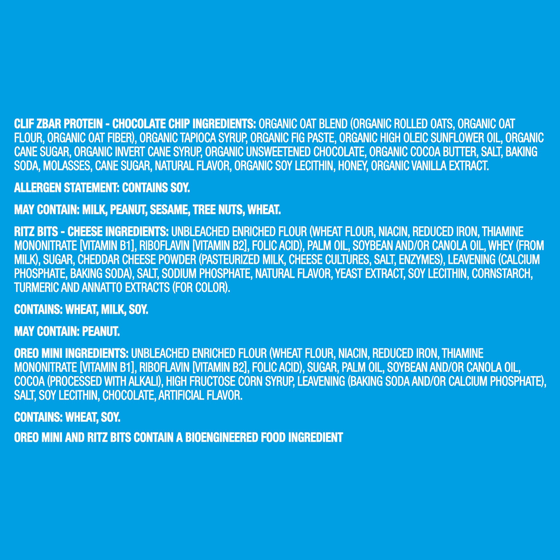 Clif Zbar: Clif Zbar Ingredients: Oat Blend* (Rolled Oats*, Oat Flour*, Oat Fiber*), Tapioca Syrup*, Fig Paste*, Sunflower and/or Soybean Oil*, Cane Sugar*, Cane Syrup*, Unsweetened Chocolate*, Natura…