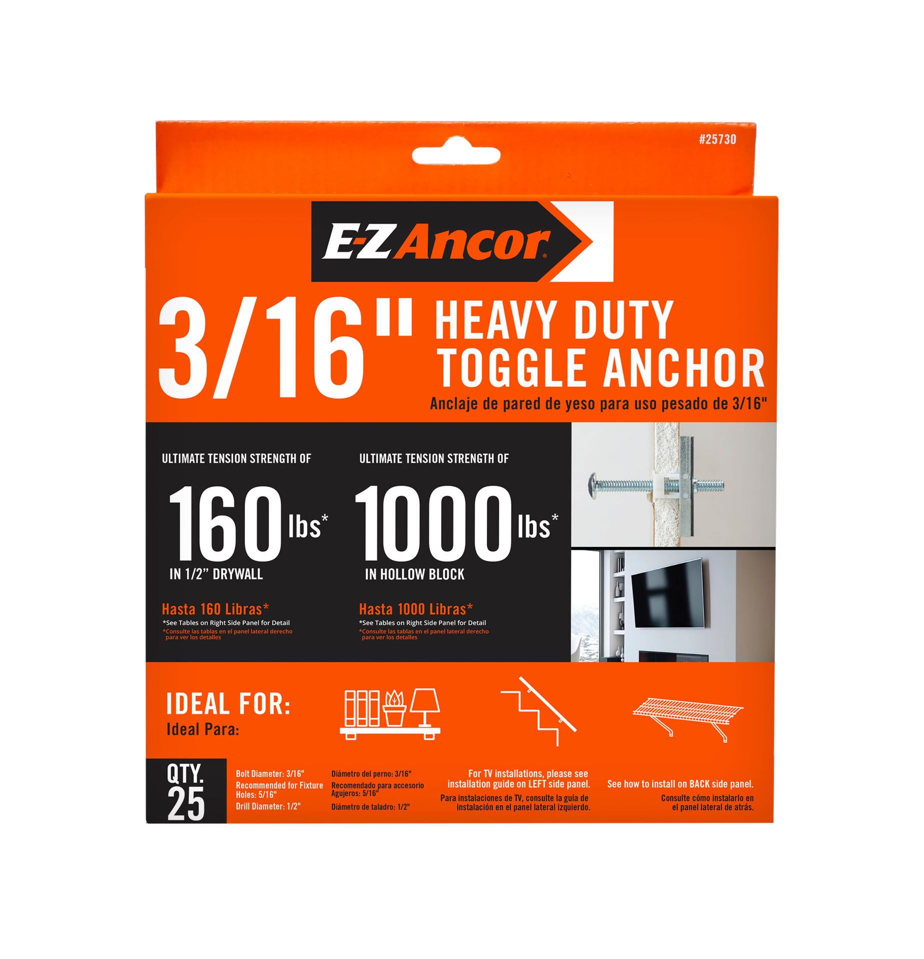 Designed for medium to heavy-duty wall applications in 1/2” and 5/8” drywall. Ideal for installing shelving, handrails, and other medium to heavy-duty wall fixtures. Holds up to 160-lbs in 1/2” drywal…