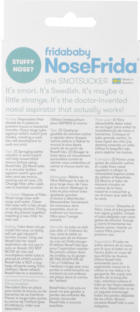 Stuffy nose? 1 NoseFrida. 4 Hygiene filters. What's the fuss? It's smart. It's Swedish. It's maybe a little strange. It's the doctor-invented nasal aspirator that actually works! The fuss stops here. …