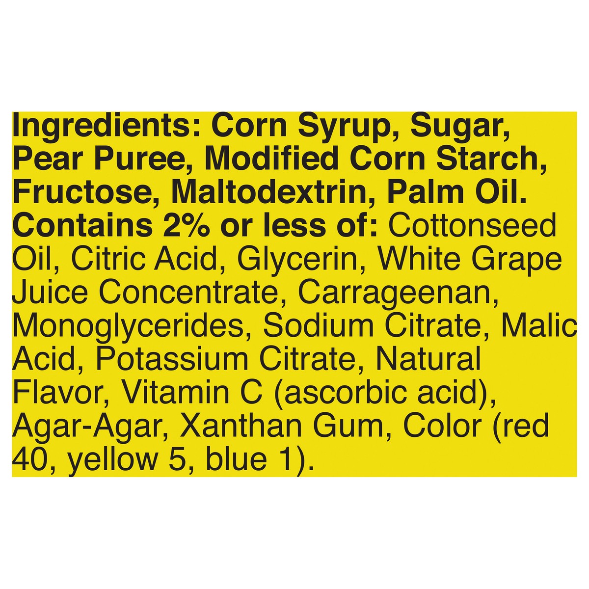 Corn Syrup, Sugar, Pear Puree, Modified Corn Starch, Fructose, Maltodextrin, Palm Oil, Contains 2% or Less of: Cottonseed Oil, Citric Acid, Glycerin, White Grape Juice Concentrate, Carrageenan, Monogl…