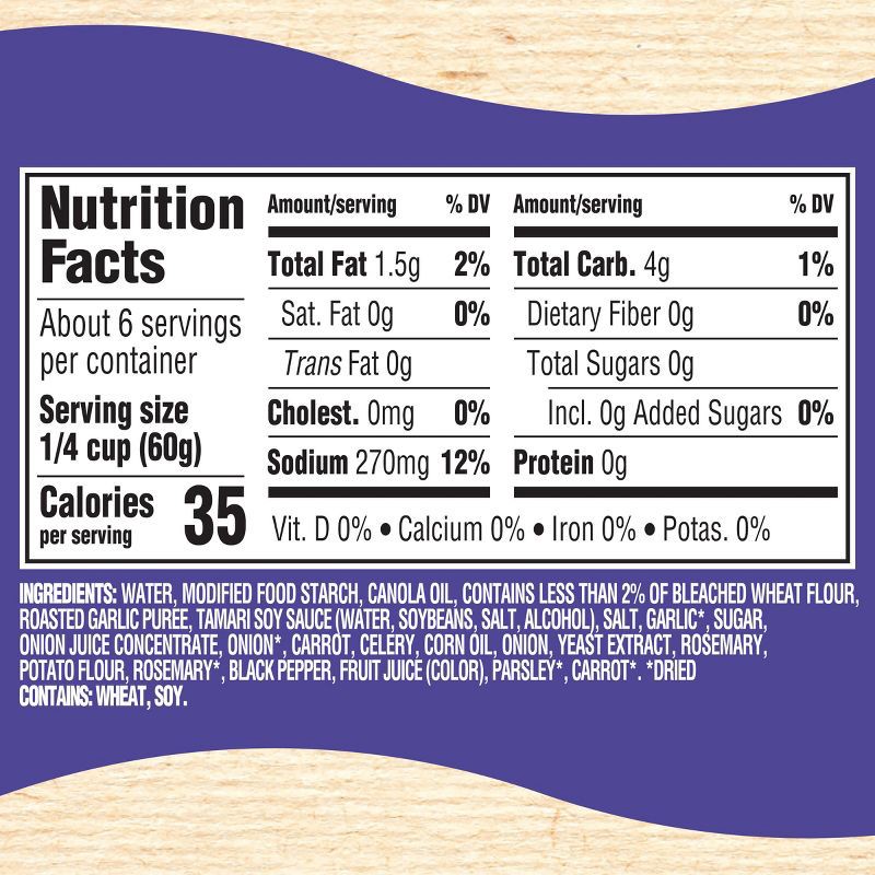 WATER, MODIFIED FOOD STARCH, CANOLA OIL, CONTAINS LESS THAN 2% OF BLEACHED WHEAT FLOUR, ROASTED GARLIC PUREE, TAMARI SOY SAUCE (WATER, SOYBEANS, SALT, ALCOHOL), SALT, GARLIC*, SUGAR, ONION JUICE CONCE…