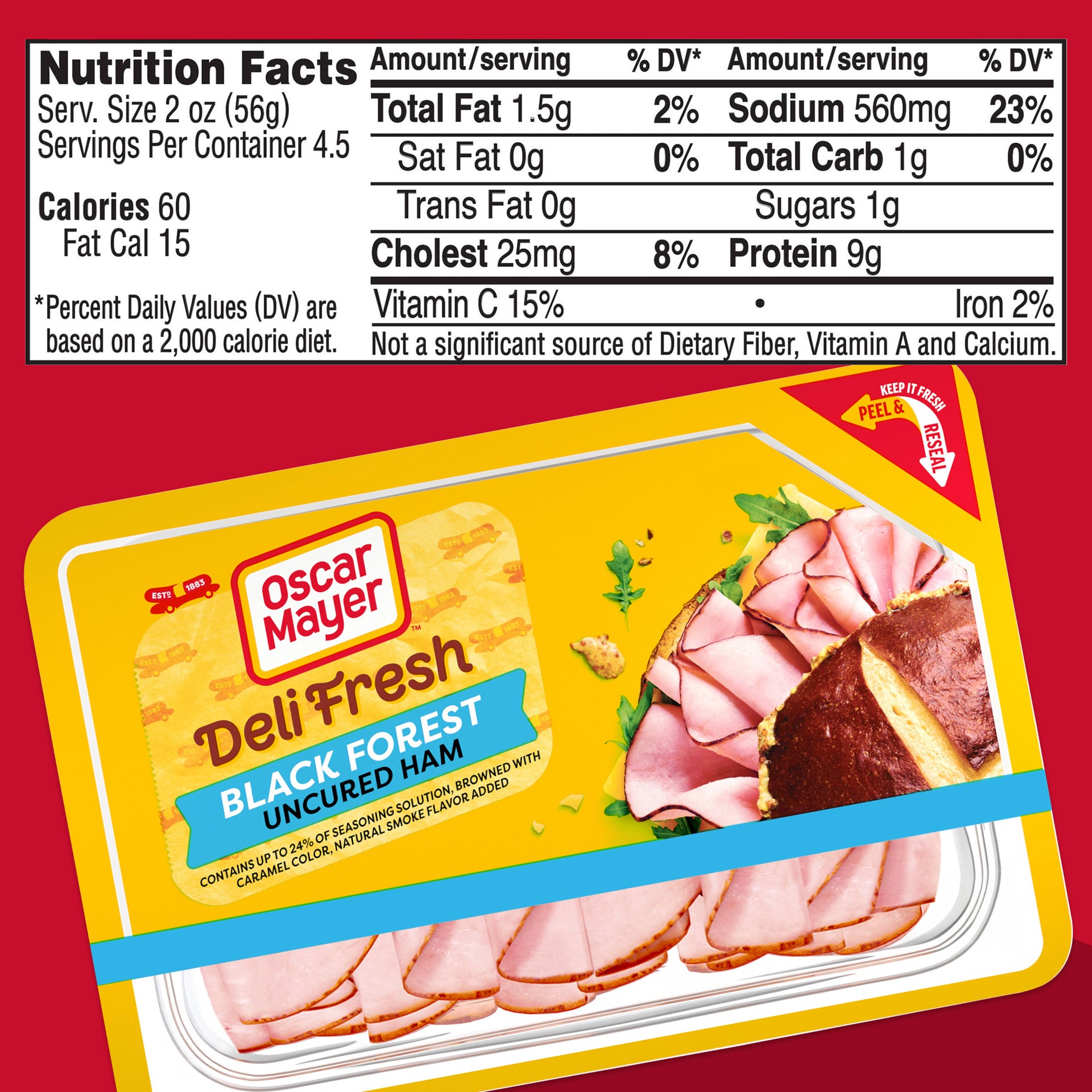 Make a delicious deli sandwich at home with Oscar Mayer Deli Fresh Black Forest Uncured Ham Contains Up To 24% Of Seasoning Solution, Natural Smoke Flavor Added, Browned with Caramel Color, Sliced Lun…