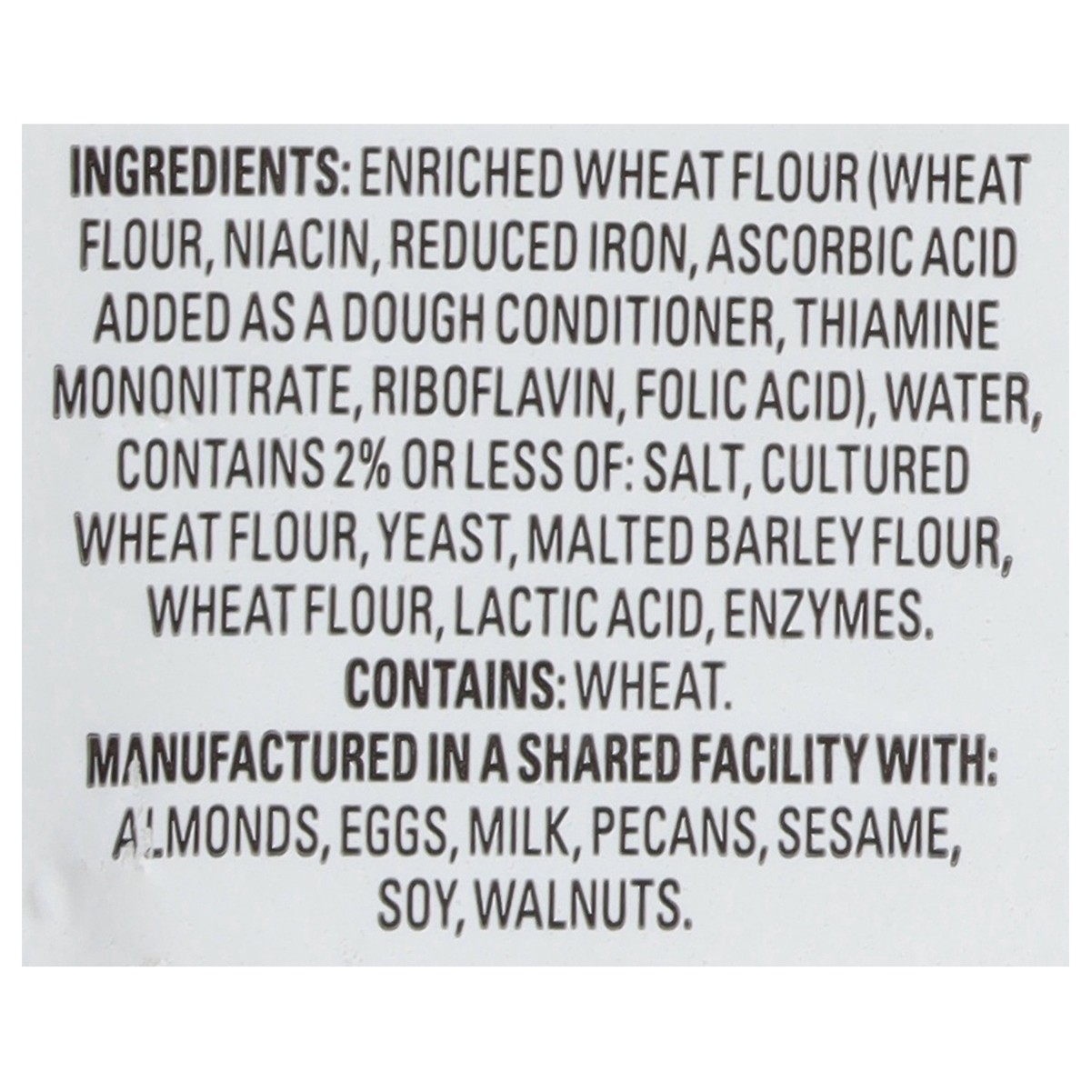 INGREDIENTS: ENRICHED WHEAT FLOUR (WHEAT FLOUR, NIACIN, REDUCEDIRON, ASCORBIC ACID ADDED AS A DOUGH CONDITIONER, THIAMINEMONONITRATE, RIBOFLAVIN, FOLIC ACID), WATER, CONTAINS 2% OR LESS OF:SALT, CULTU…