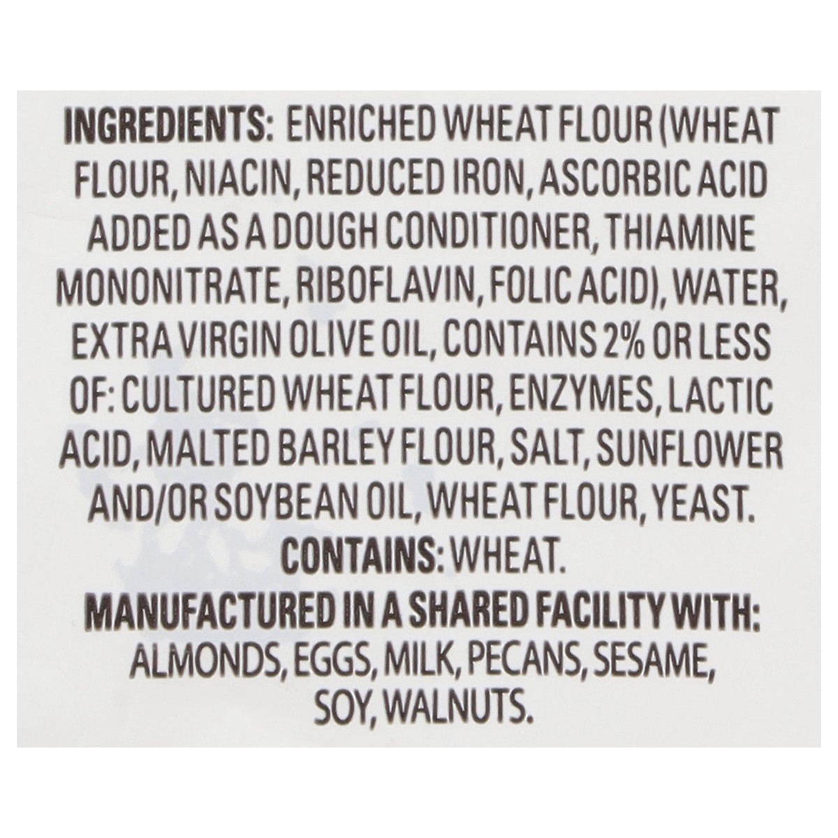 INGREDIENTS: ENRICHED WHEAT FLOUR (WHEAT FLOUR, NIACIN, REDUCEDIRON, ASCORBIC ACID ADDED AS A DOUGH CONDITIONER, THIAMINEMONONITRATE, RIBOFLAVIN, FOLIC ACID), WATER, EXTRA VIRGIN OLIVE OIL,CONTAINS 2%…