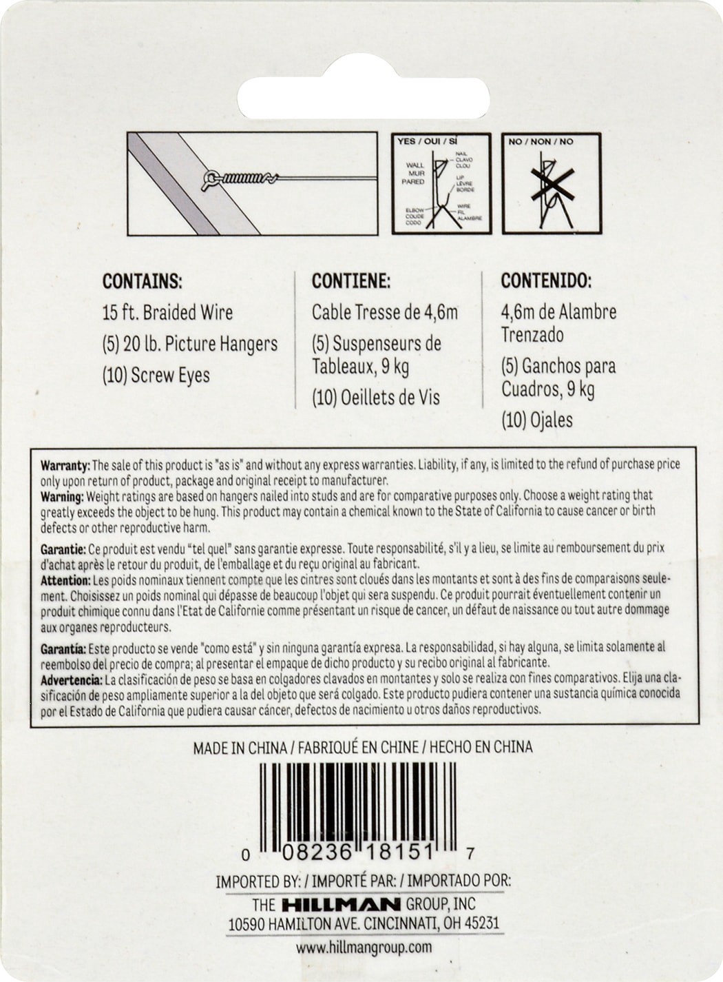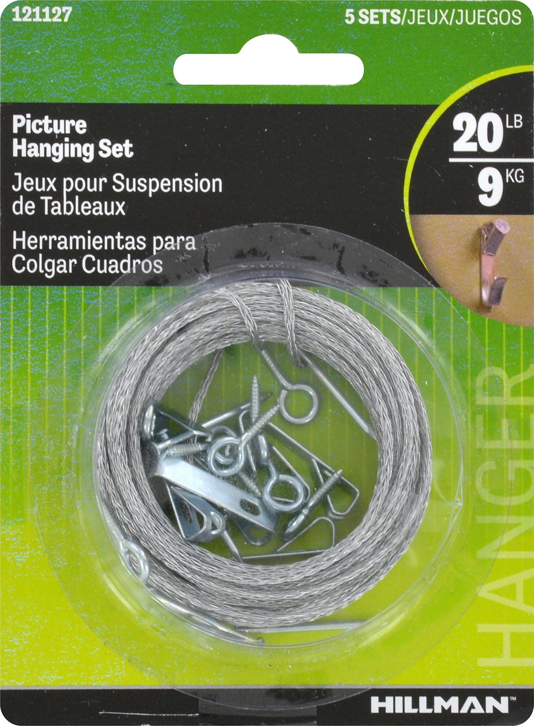 20lb weight capacity. Includes: (1) 15-ft braided picture hanging wire, (5) 20-lb picture hangers and (10) screw eyes. Picture hanging kits are great for hanging a gallery or several pictures of varyi…