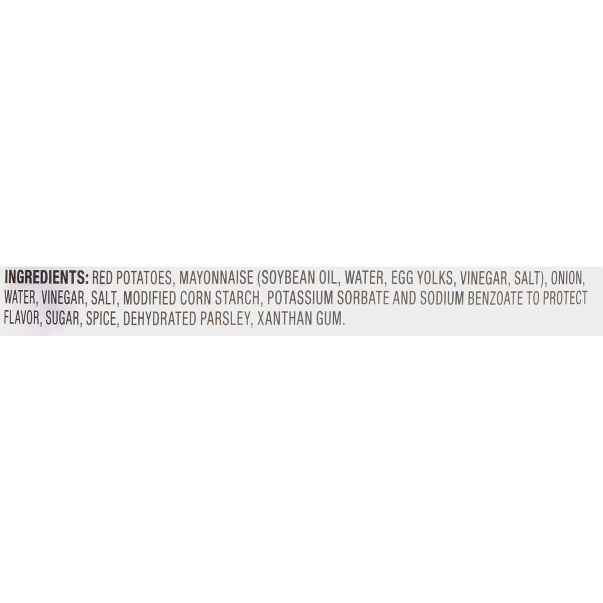 Red Potatoes, Mayonnaise (Soybean Oil, Water, Egg Yolks, Vinegar, Salt), Onion, Water, Vinegar, Salt, Modified Corn Starch, Potassium Sorbate and Sodium Benzoate to Protect Flavor, Sugar, Spice, Dehyd…