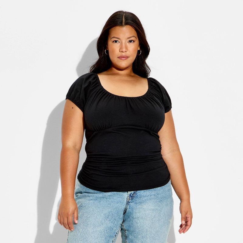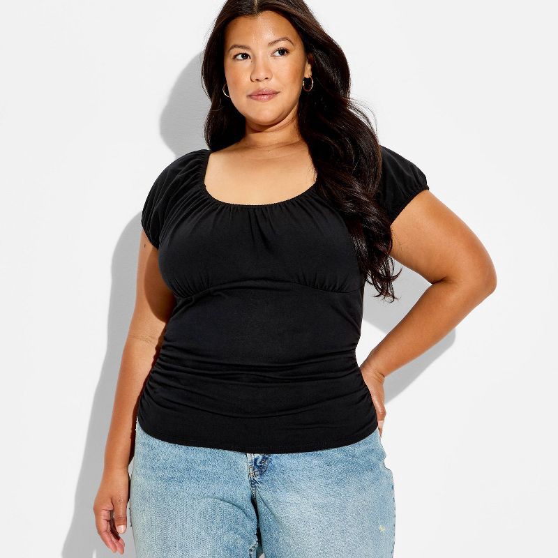 Emma top from Wild Fable™ with ruched detailing. Features a scoop neckline and cap sleeves, highlighted with elastic-cinched trimming. Made from a lightweight woven fabric blend of cotton, recycled co…