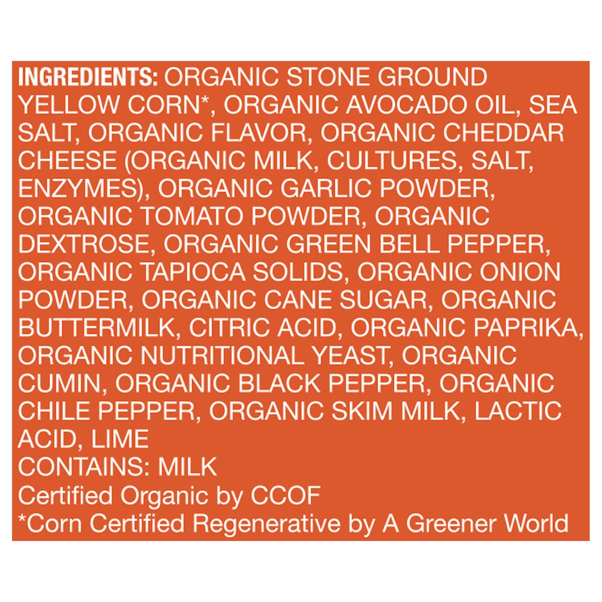 Organic Stone Ground Yellow Corn*, Organic Avocado Oil, Sea Salt, Organic Flavor, Organic Cheddar Cheese (Organic Milk, Cultures, Salt, Enzymes), Organic Garlic Powder, Organic Tomato Powder, Organic …