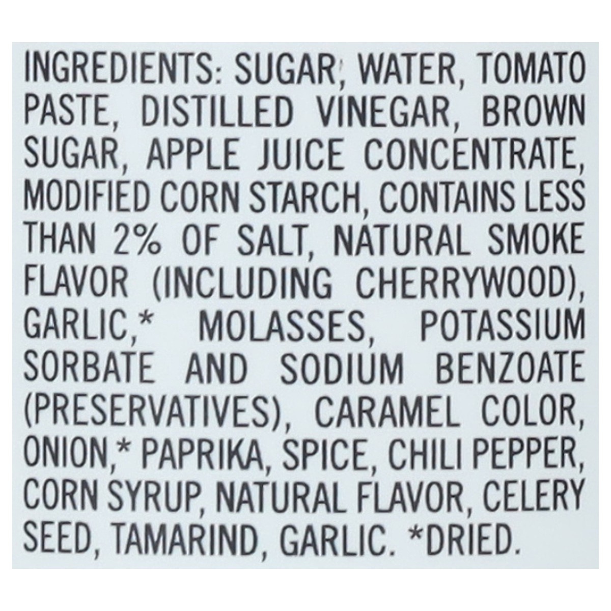 Sugar, Water, Tomato Paste, Distilled Vinegar, Brown Sugar, Apple Juice Concentrate, Modified Corn Starch, Contains Less than 2% of Salt, Natural Smoke Flavor (Including Cherrywood), Garlic*, Molasses…
