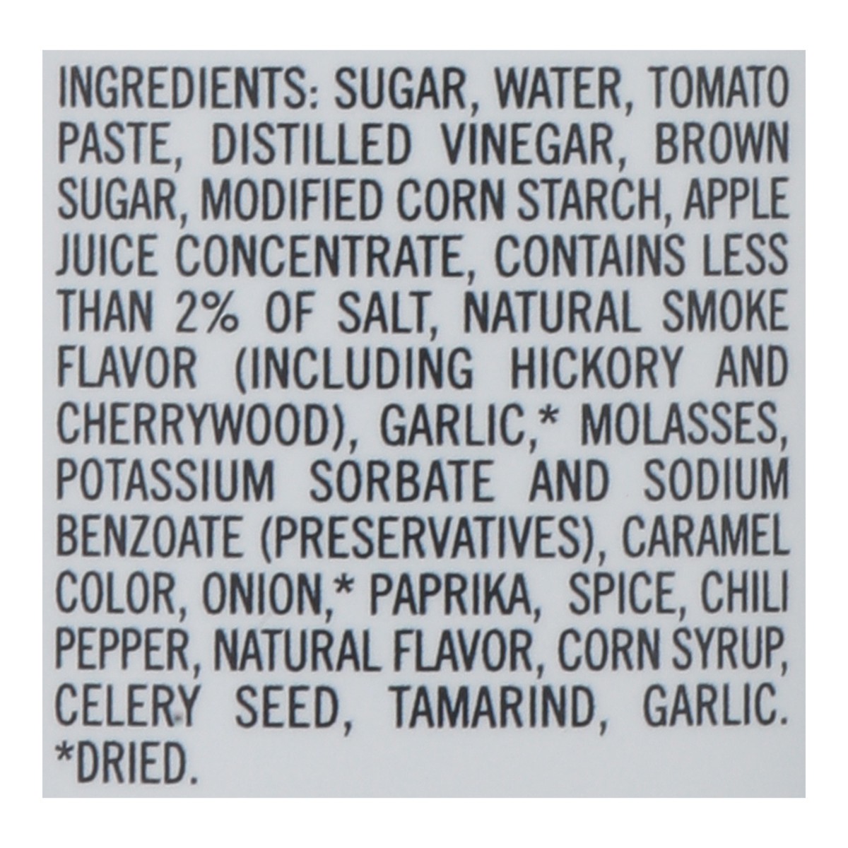 Sugar, Water, Tomato Paste, Distilled Vinegar, Brown Sugar, Modified Corn Starch, Apple Juice Concentrate, Contains Less than 2% of Salt, Natural Smoke Flavor (Including Hickory and Cherrywood), Garliā¦