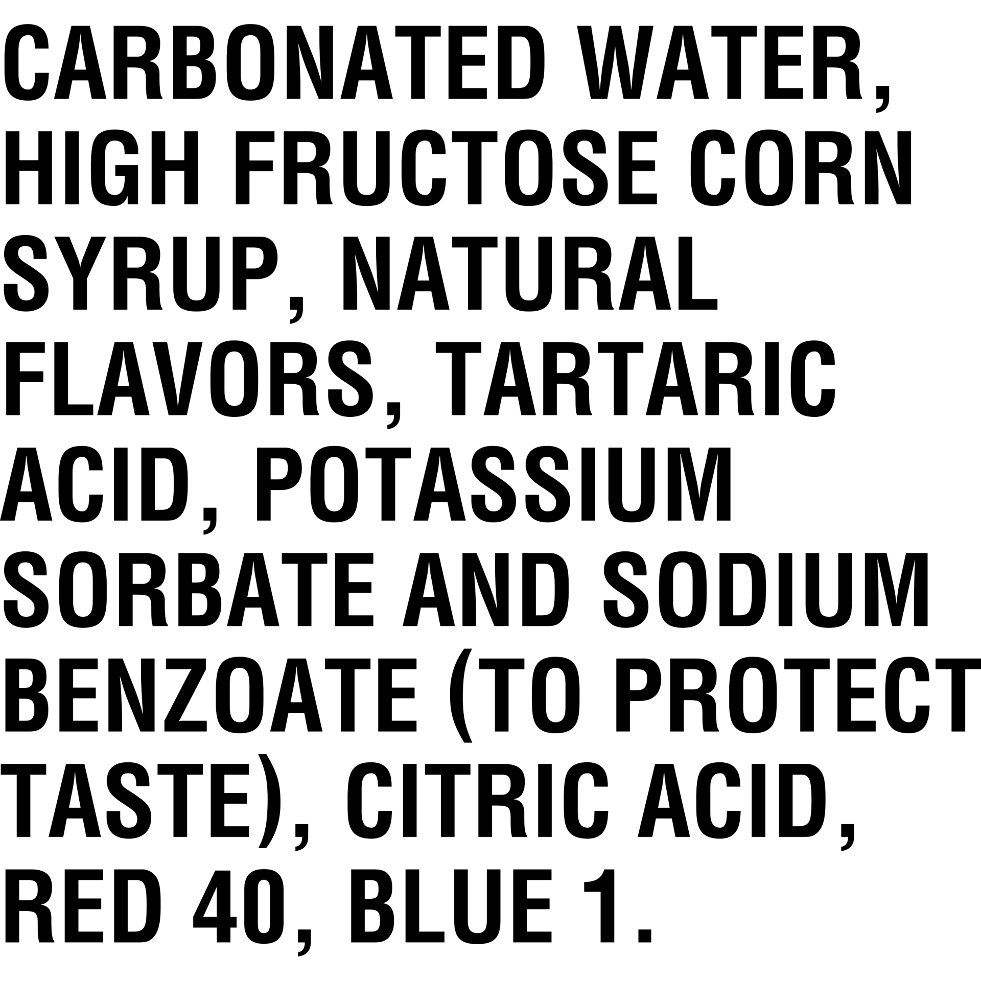 Carbonated Water, High Fructose Corn Syrup, Natural Flavors, Tartaric Acid, Potassium Sorbate And Sodium Benzoate (To Protect Taste), Citric Acid, Red 40, Blue 1.