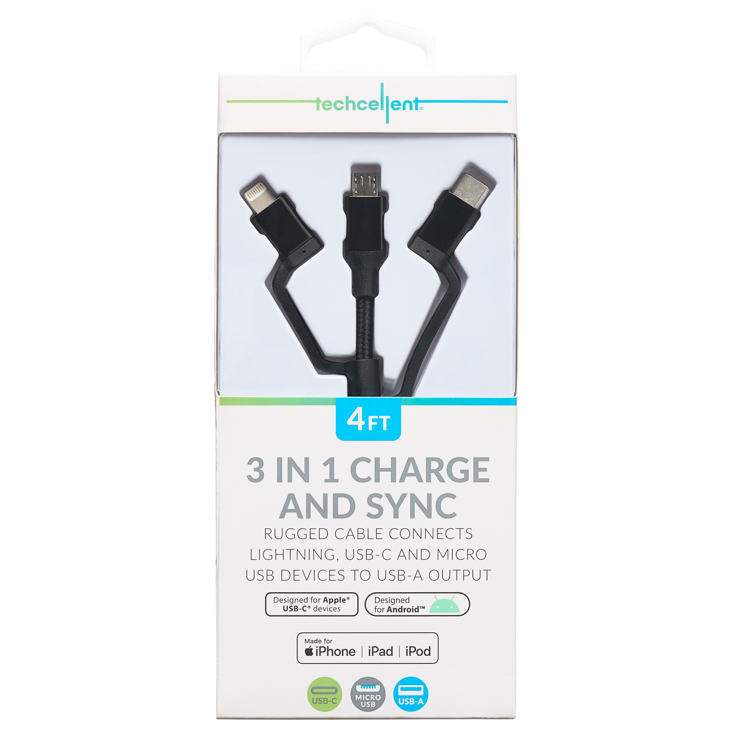Techcellent 4 ft 3-in-1 Charge and Sync Lightning, Micro, and Type-C Cable - Black