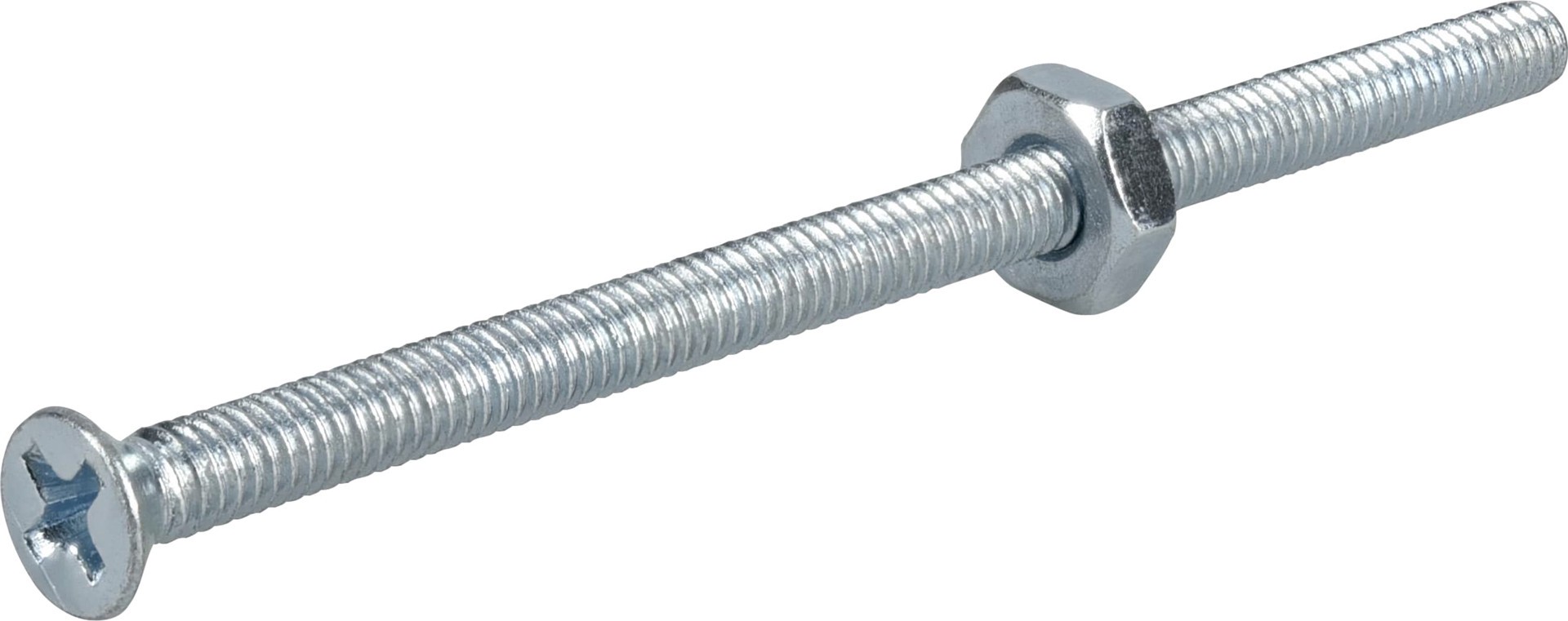 Common applications include machines, appliances, electronic devices, and vehicles. Flat-head Phillips machine screws with nuts. 3 pieces per retail package. Phillips drive.