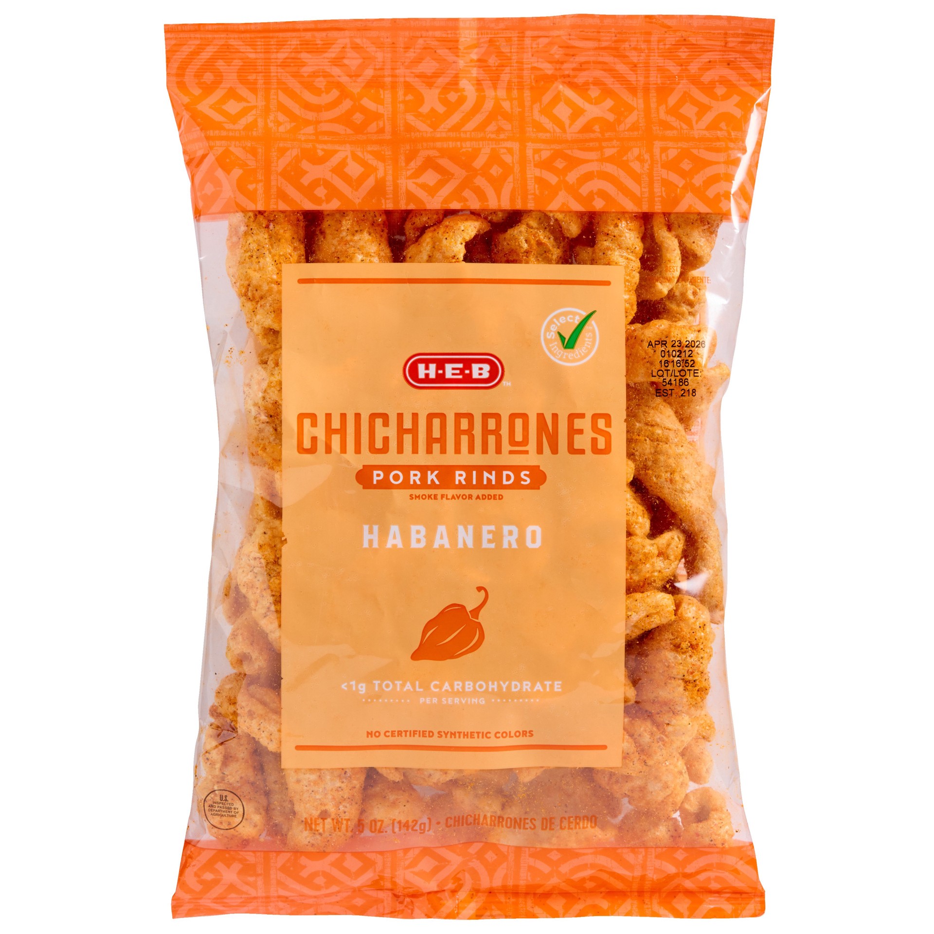 Looking for a snack with lots of crunch? These habanero pepper-flavored H-E-B Chicharrones are cooked until crispy and airy. Delicious all on their own, you can also sprinkle these pork rinds onto tac…