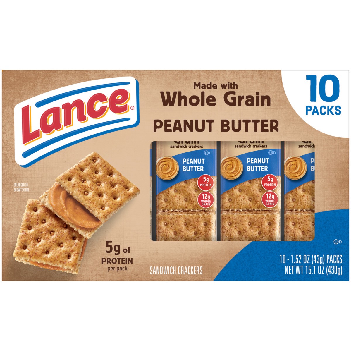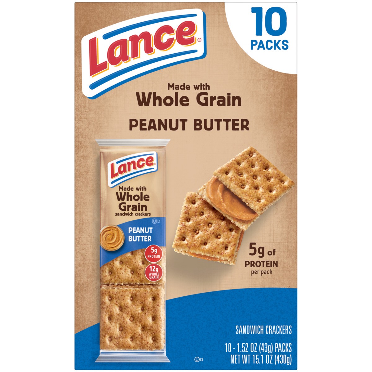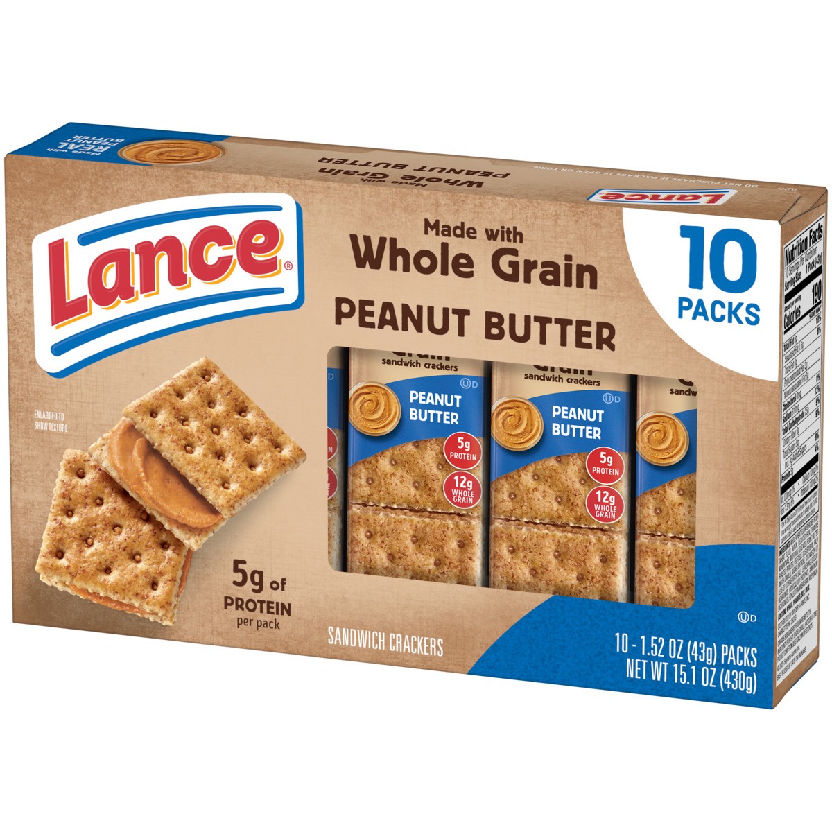 Enjoy a satisfying snack on the go, anytime, with Lance Made with Whole Grain Peanut Butter Crackers. Baked with whole grain and made with real peanut butter filling, they come in convenient packs tha…