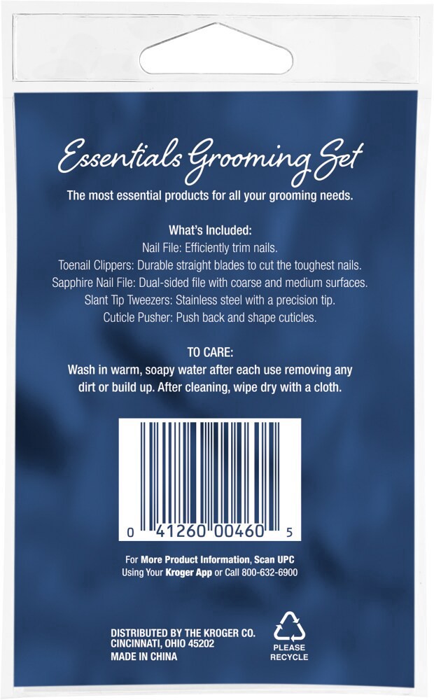 The most essential products for all your grooming needs.Includes: Nail file, toenail clippers, sapphire nail file, slant tip tweezers, cuticle pusher.