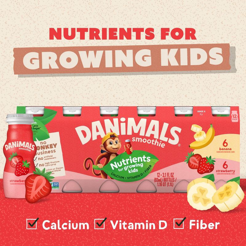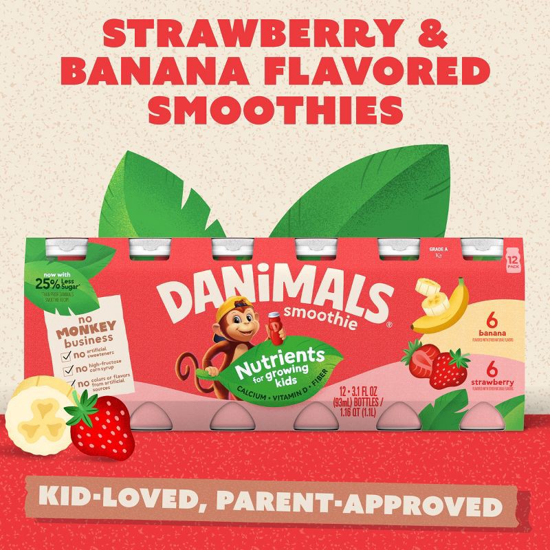 - MESS-FREE, CONVENIENT SMOOTHIE BOTTLES: Twelve 3.1 oz bottles of Danimals Strawberry and Banana Smoothies, perfect on-the-go snacks for kids