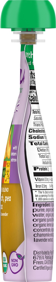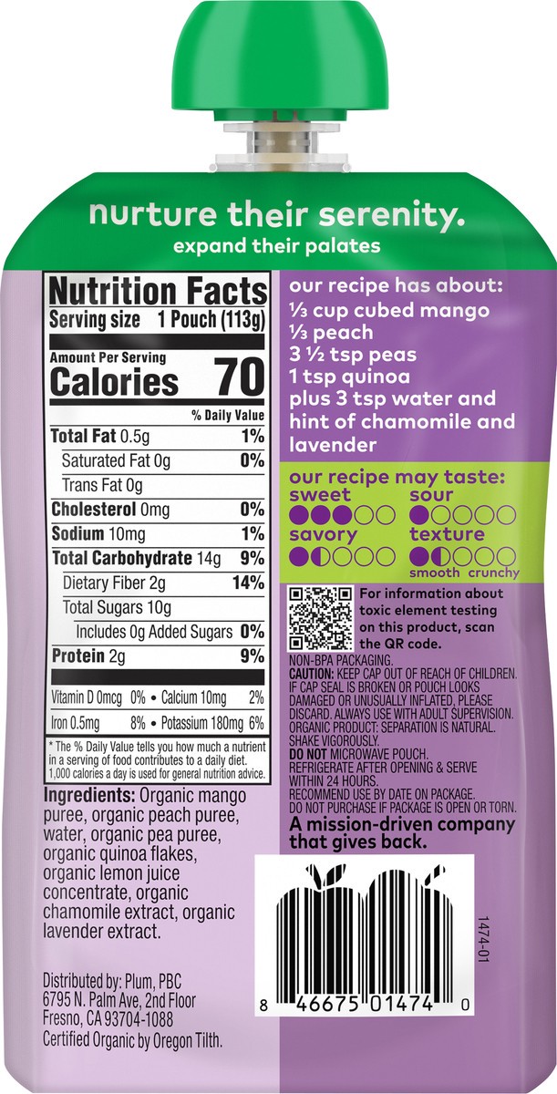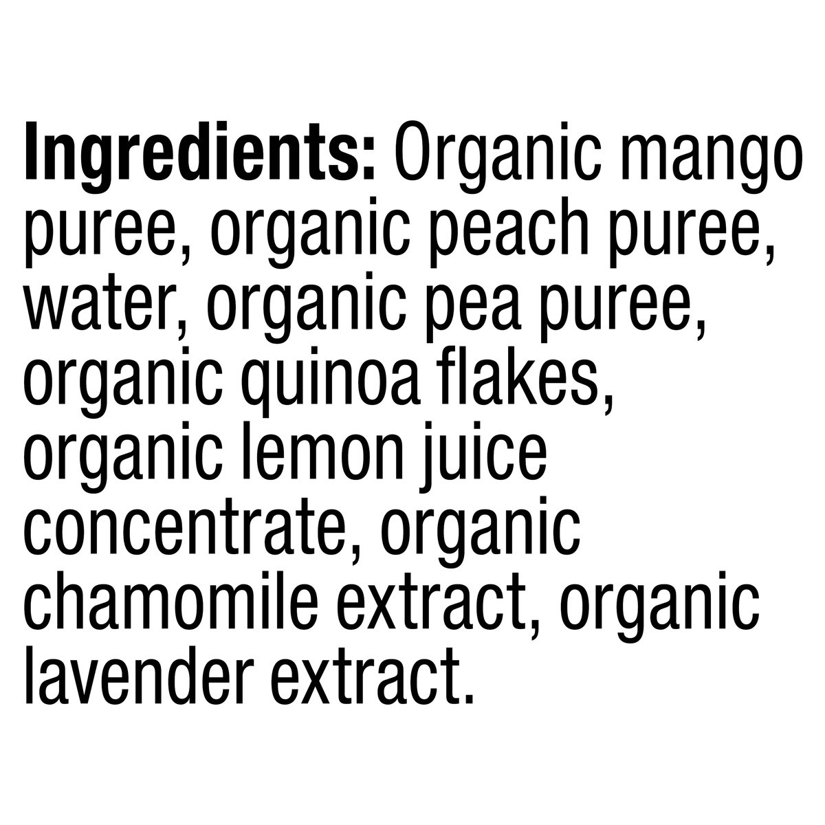 Ingredients: Organic Mango Puree, Organic Peach Puree, Water, Organic Pea Puree, Organic Quinoa Flakes, Organic Lemon Juice Concentrate, Organic Chamomile Extract, Organic Lavender Extract.