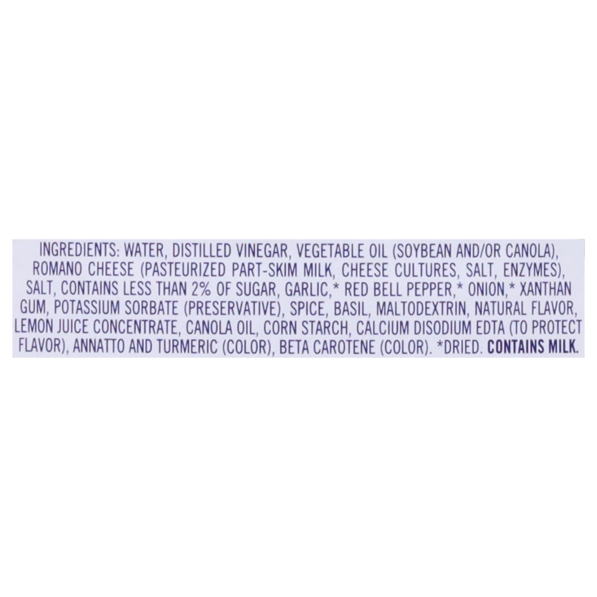 Water, Distilled Vinegar, Vegetable Oil (Soybean and/or Canola), Romano Cheese (Pasteurized Part-Skim Milk, Cheese Cultures, Salt, Enzymes), Salt, Contains Less than 2% of Sugar, Garlic*, Red Bell Pep…