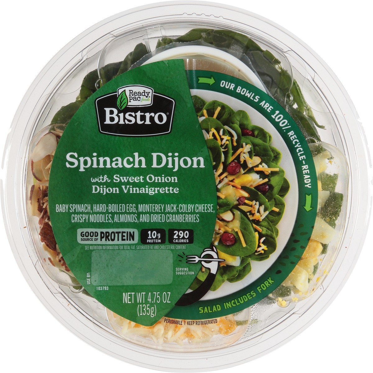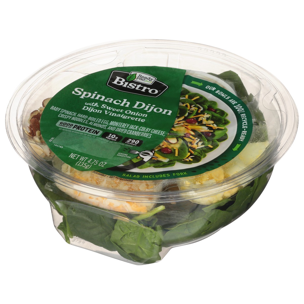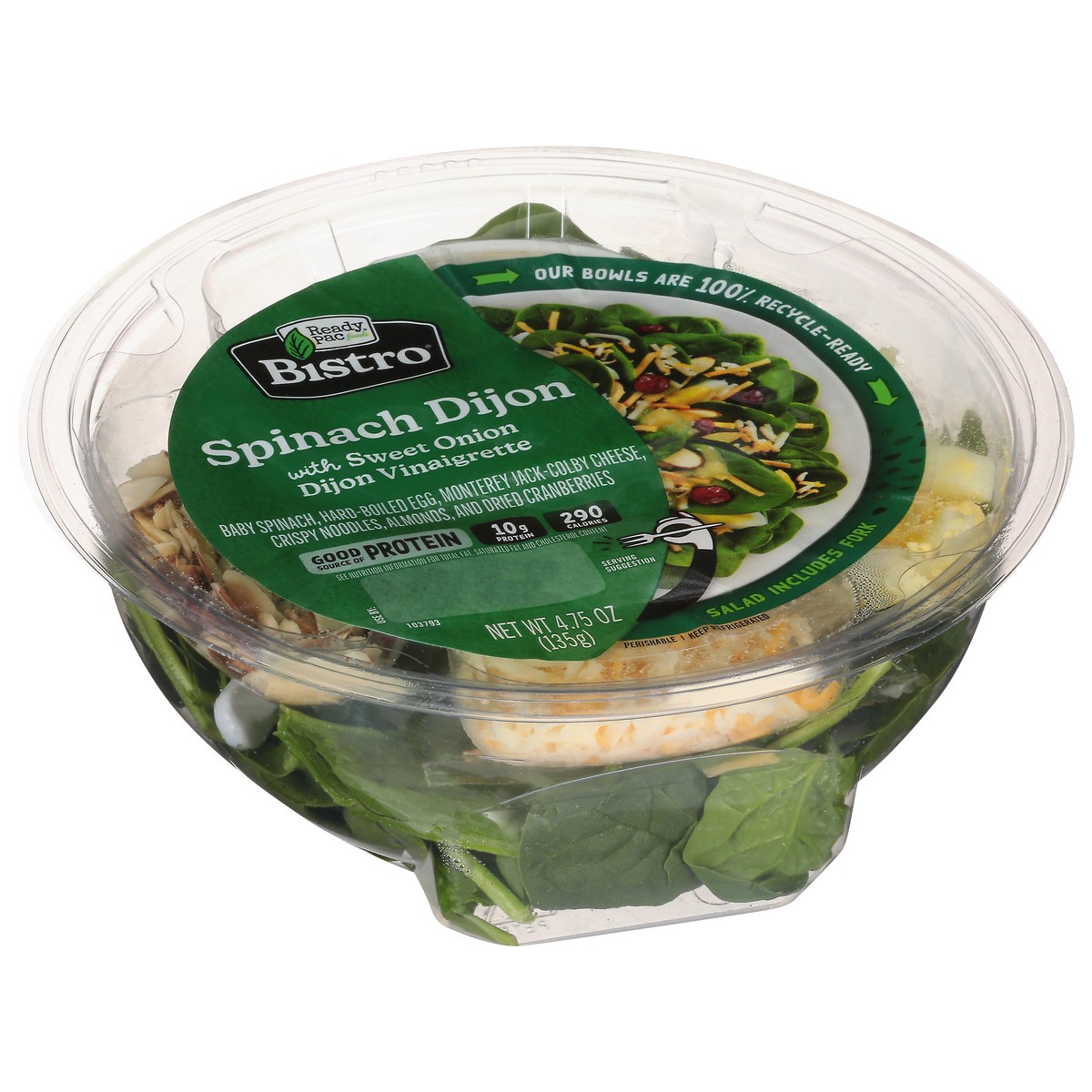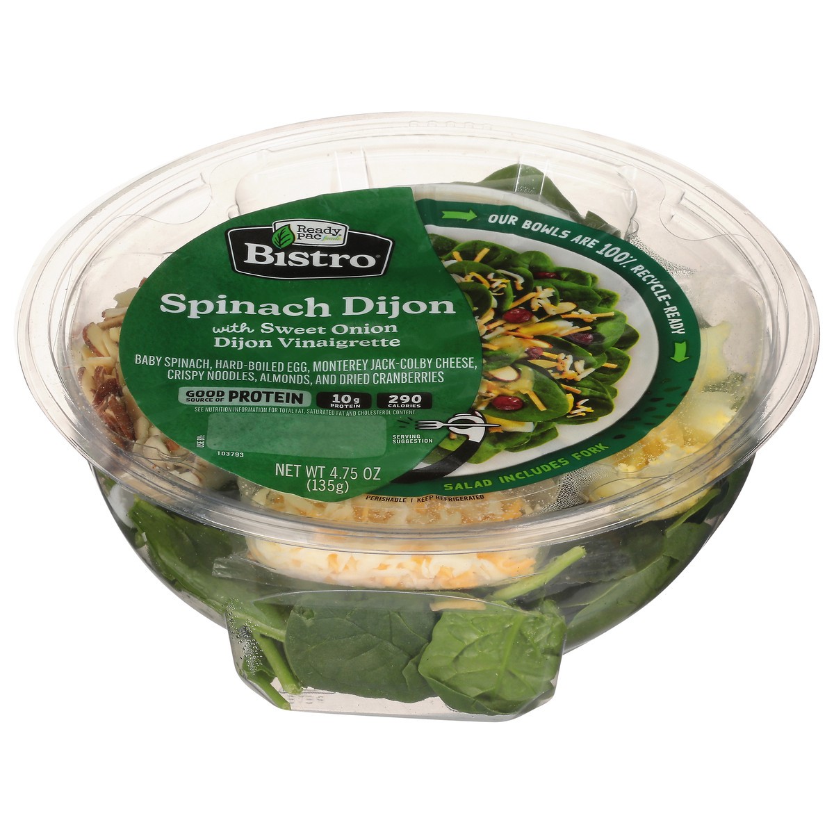 Spinach Dijon Salad Bowl - 4.75oz.Baby spinach, hard-boiled egg, almonds, dried cranberries, jack-Colby cheese with crispy noodles, sweet onion Dijon vinaigrette. 280 Calories & 10 grams of Protein.Pe…