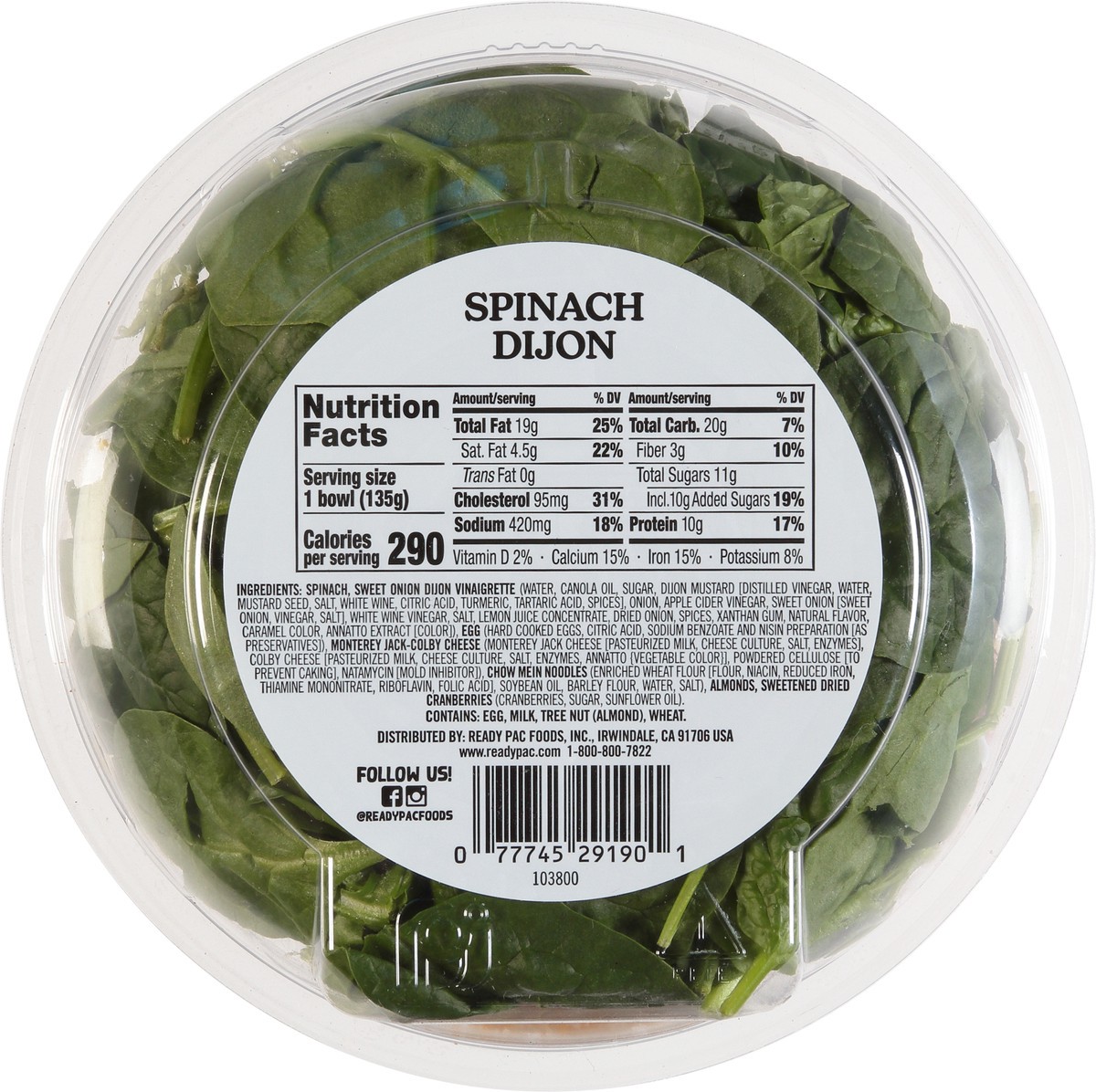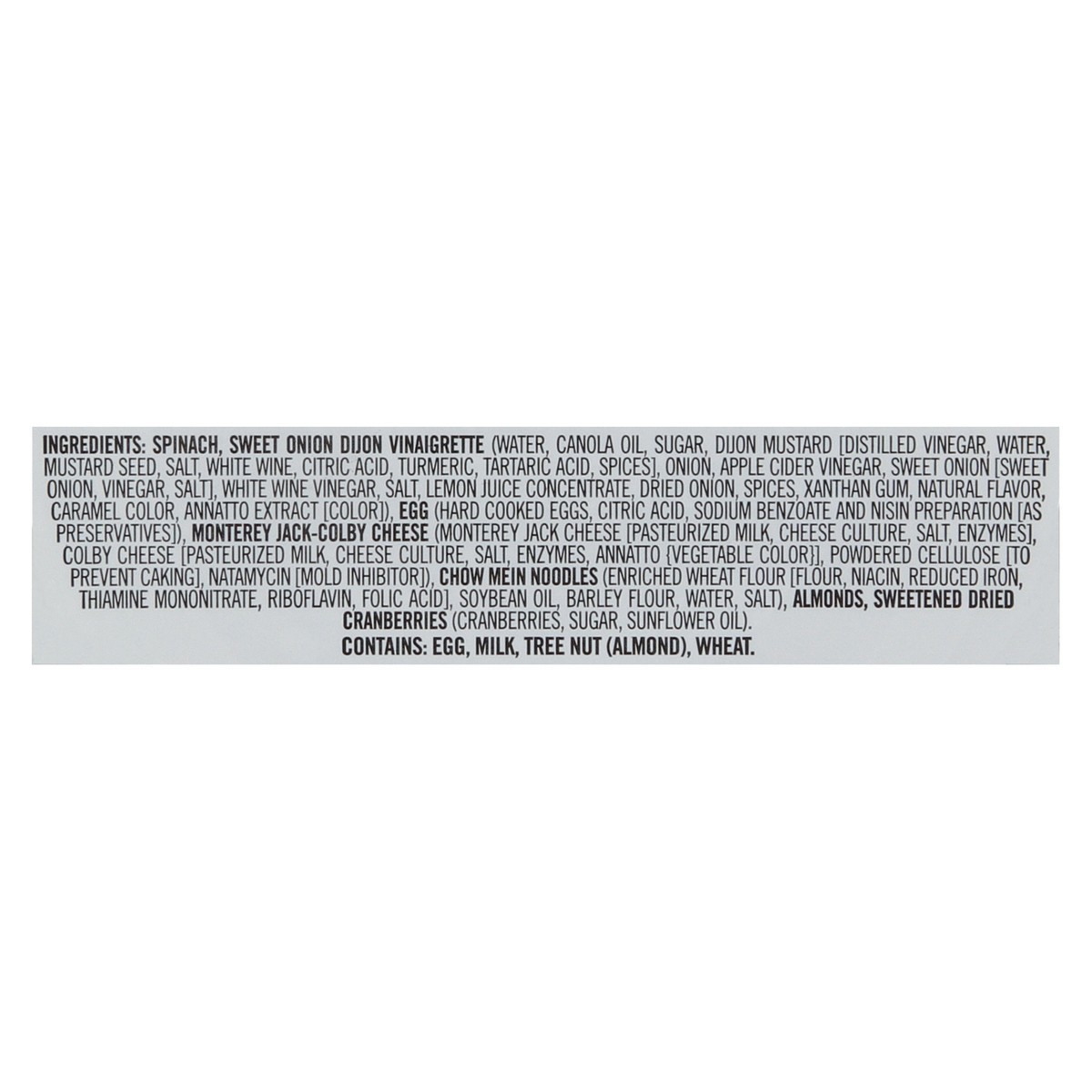 Baby Spinach, Sweet Onion Dijon Vinaigrette (Water, Vegetable Oil [Canola and/or Soybean Oil], Sugar, Dijon Mustard [Distilled Vinegar, Water, Mustard Seed, Salt, White Wine, Citric Acid, Turmeric, Ta…