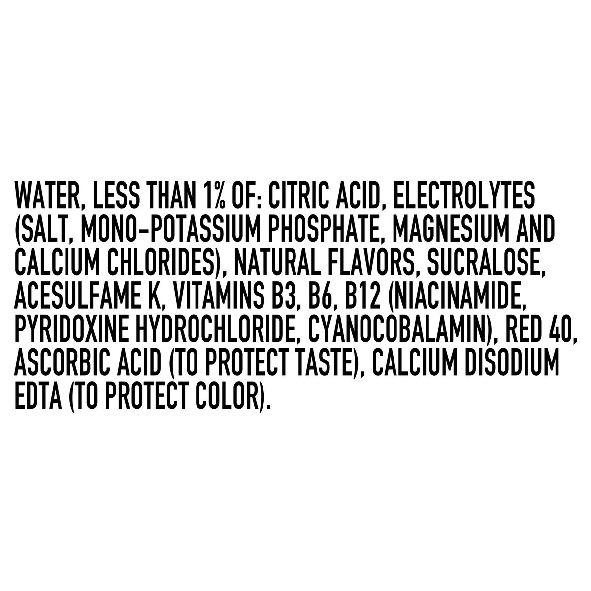 WATER, LESS THAN 1% OF: CITRIC ACID, SALT AND MONO-POTASSIUM PHOSPHATE AND MAGNESIUM CHLORIDE AND CALCIUM CHLORIDE (ELECTROLYTE SOURCES), NATURAL FLAVORS, SUCRALOSE, ACESULFAME POTASSIUM, VITAMIN B3 (…