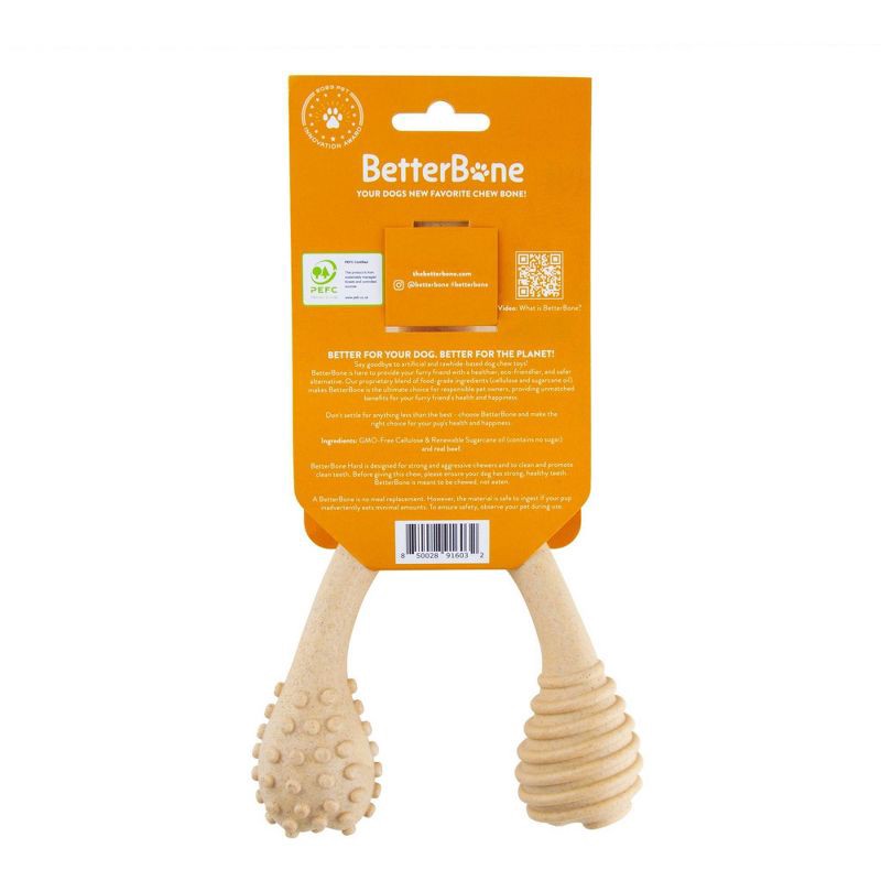 - BetterBone HARD is the ultimate natural & durable chew toy for strong, tough, & aggressive chewers! Crafted from all-natural, food-grade ingredients, it is designed to promote health and dental hygiene with its super durable natural, food-grade, GMO-free ingredients. Our unique teeth-cleaning ends reach tricky, hard-to-clean areas. Pair this with our natural, non-toxic, hypoallergenic, and splinter-resistant composition;