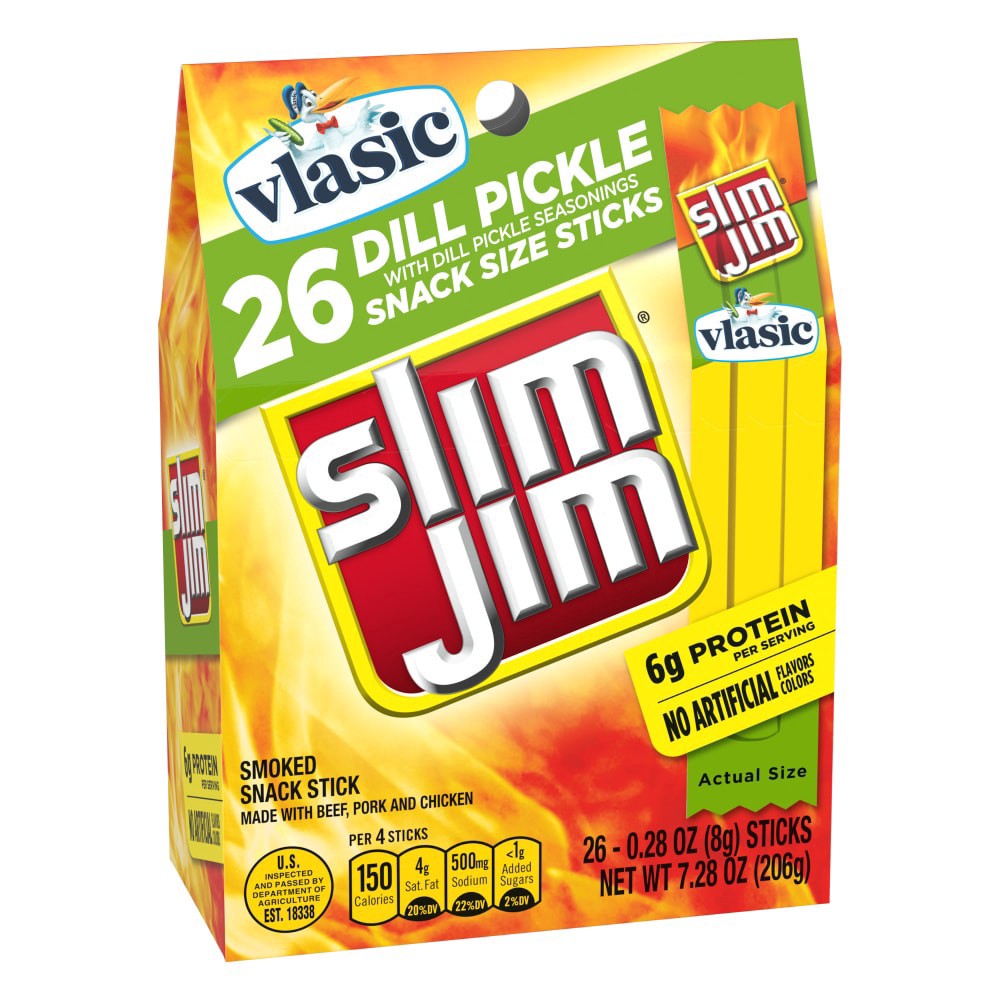 When it comes to snacking, flavor matters. That's why Slim Jim Vlasic Dill Pickle Snack Size Meat Sticks pack giant taste into a snack-size stick. Made with beef, pork and chicken and containing 6 gra…