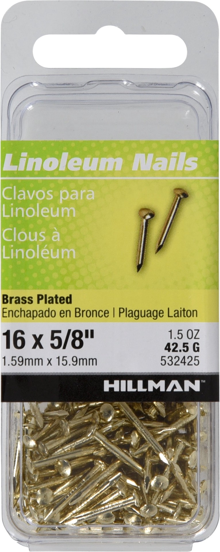 1.5 oz per package - item sold by weight, so piece counts may vary. Used to install linoleum flooring. For nailing down linoleum, wood and metal trim strips. Brass-plated. Sharp point drives easily in…