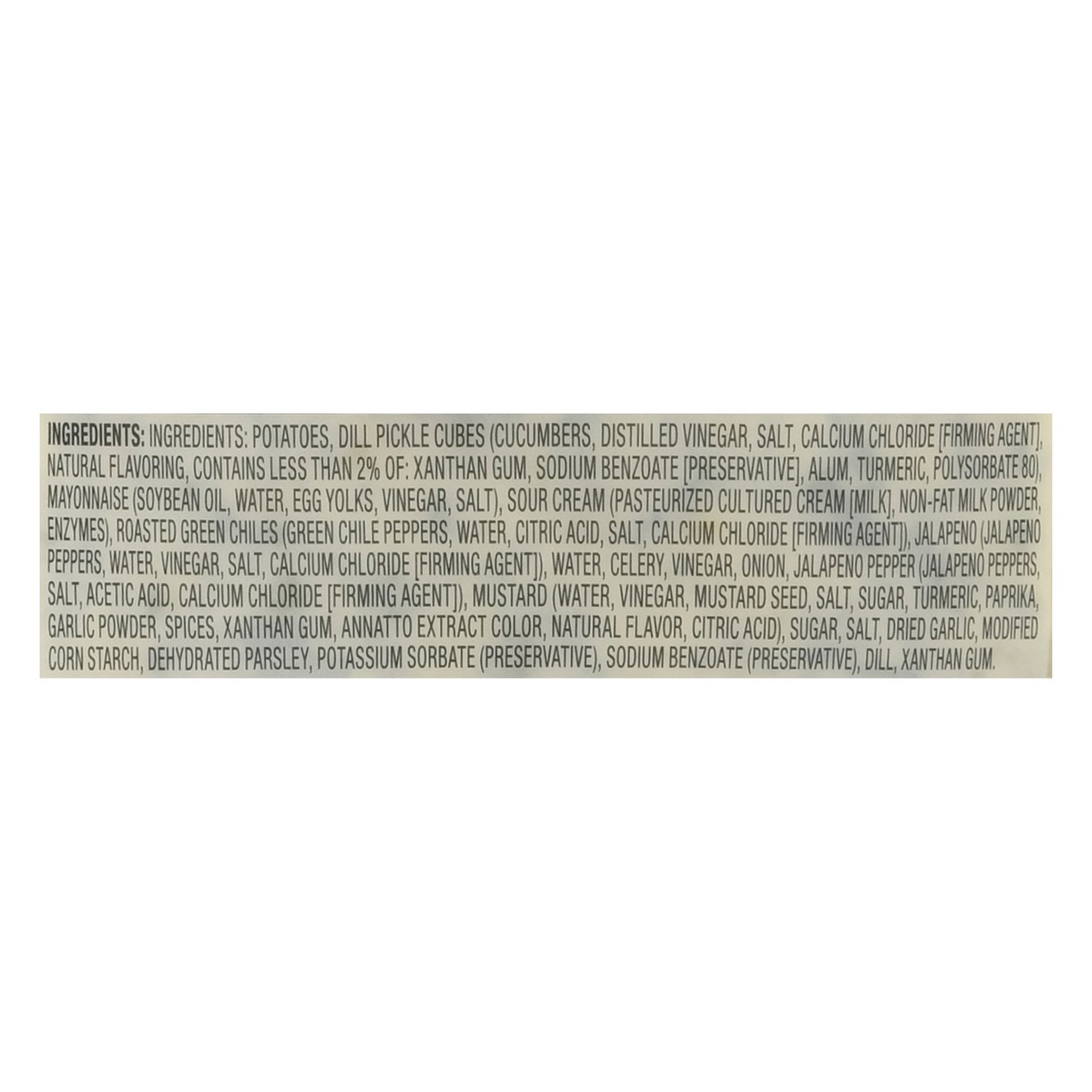 Potatoes, Dill Pickle Cubes (Cucumbers, Distilled Vinegar, Salt, Calcium Chloride [Firming Agent], Natural Flavoring, Contains Less than 2% of: Xanthan Gum, Sodium Benzoate [Preservative], Alum, Turme…