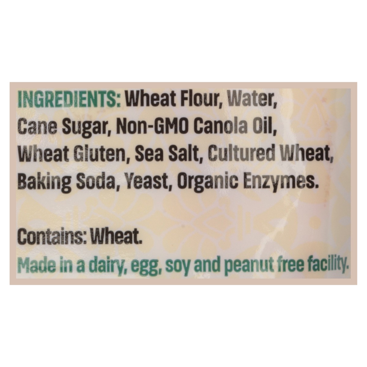 Wheat Flour, Water, Cane Sugar, Non-GMO Canola Oil, Wheat Gluten, Sea Salt, Cultured Wheat, Baking Soda, Yeast, Organic Enzymes.