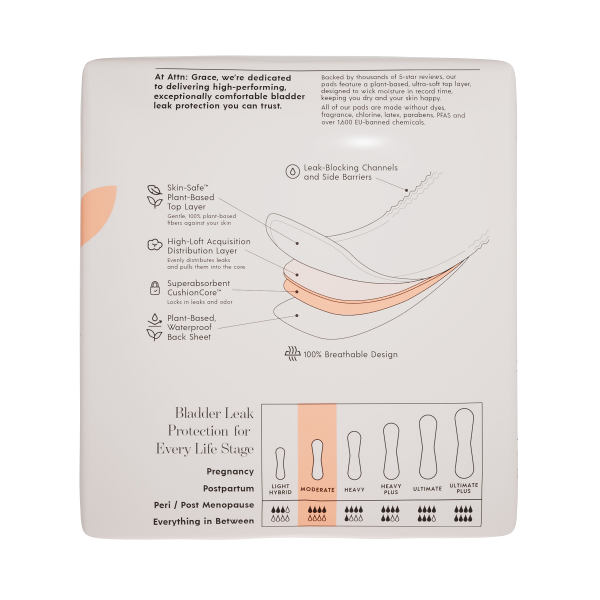 Attn Grace patented incontinence pads features several key elements.Their Skin Safe design allows only sugar cane fibers to touch the skin.The pads are free of harsh chemicals, fragrance dyes,latex,pa…