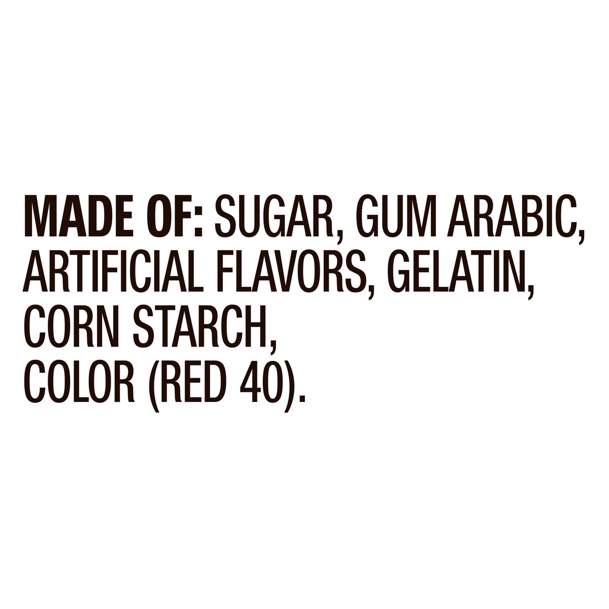 SUGAR, GUM ARABIC, ARTIFICIAL FLAVOR, GELATIN, RED 40.