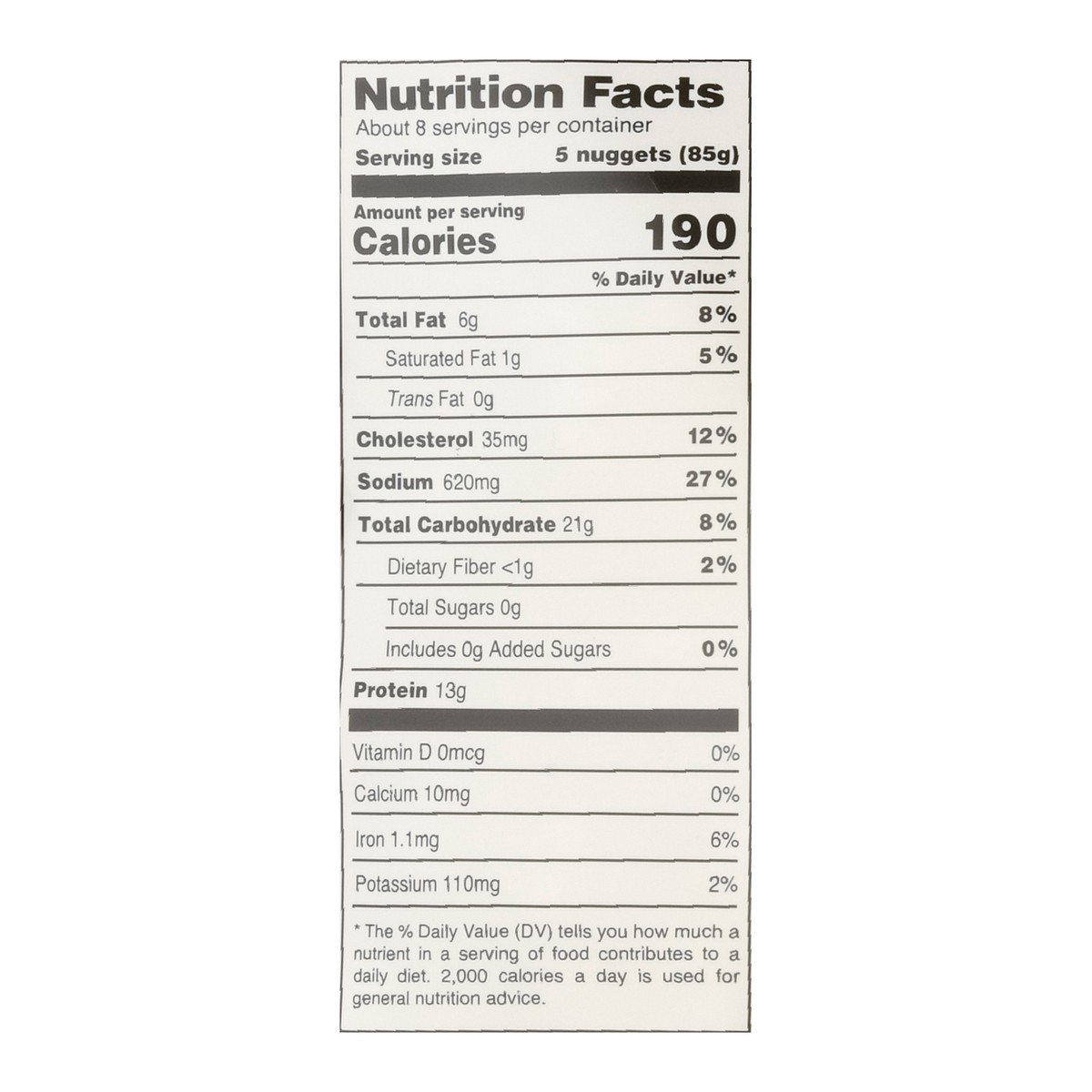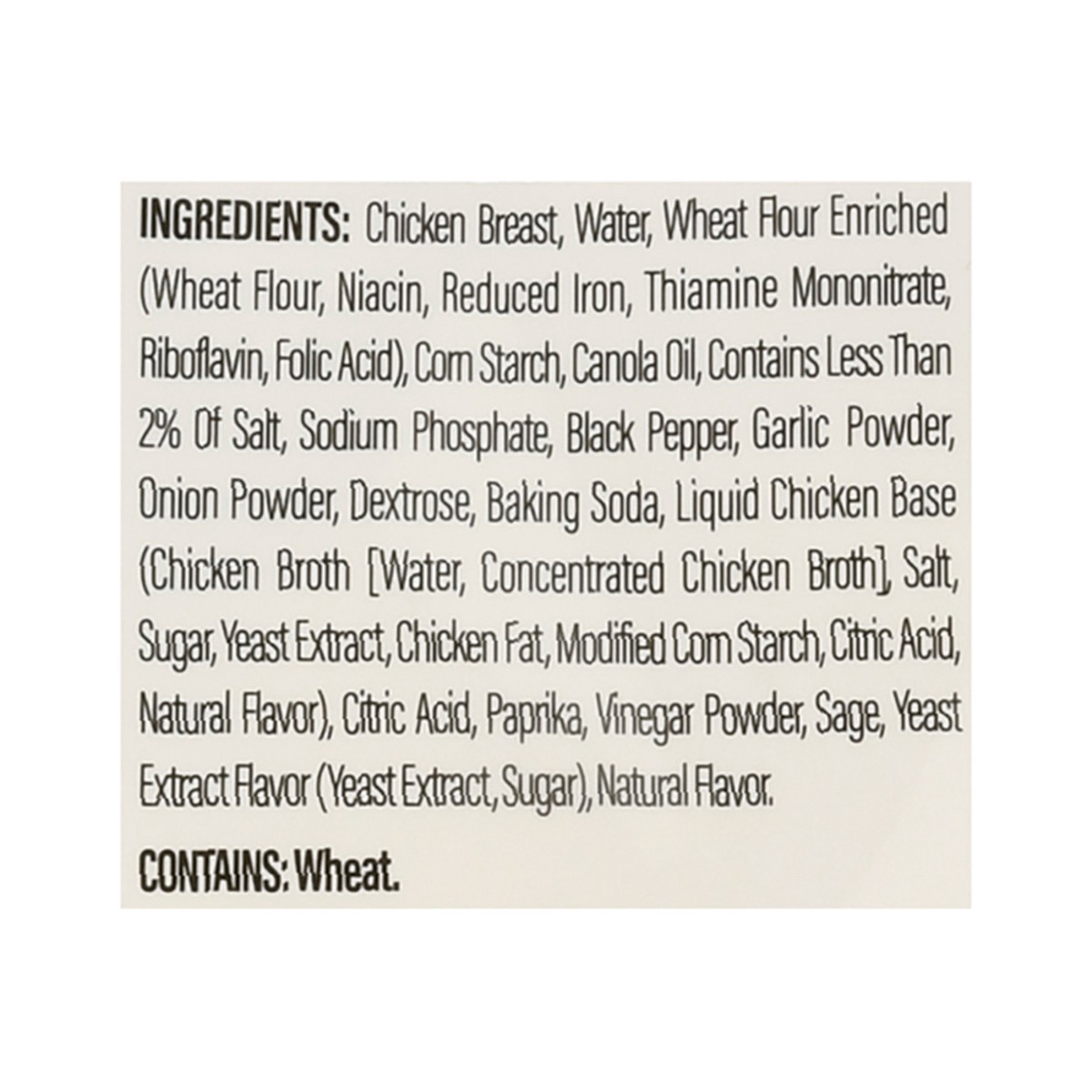 Chicken Breast, Water, Wheat Flour Enriched (Wheat Flour, Niacin, Reduced Iron, Thiamine Mononitrate, Riboflavin, Folic Acid), Corn Starch, Canola Oil, Contains Less than 2% of Salt, Sodium Phosphate,…