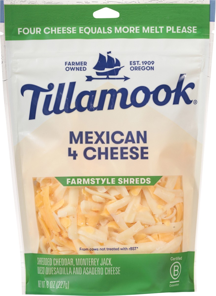 Take home a melty cheese with Tillamook Farmstyle Shredded Mexican 4 Cheese that is cut thick from the block. Featuring asadero cheese, queso quesadilla cheese, monterey jack cheese and medium cheddar…