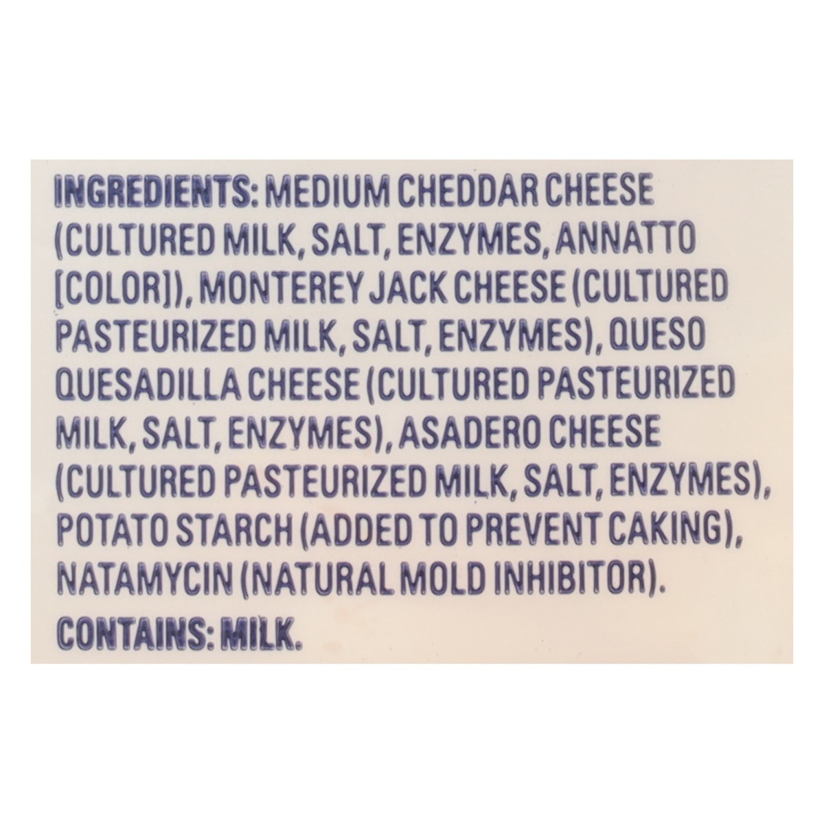 Medium Cheddar Cheese (Cultured Milk, Salt, Enzymes, Annatto [Color]), Monterey Jack Cheese (Cultured Pasteurized Milk, Salt, Enzymes), Queso Quesadilla Cheese (Cultured Pasteurized Milk, Salt, Enzyme…