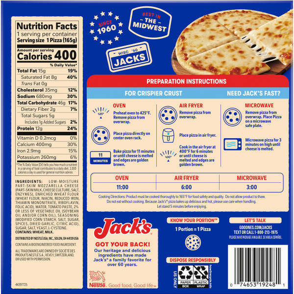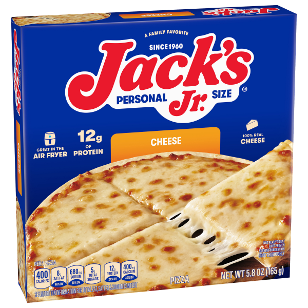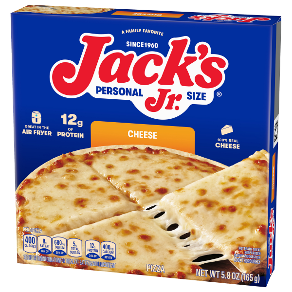Jack’s Jr. Personal Size Pizza pack includes one 6-inch cheese pizza. Our thin crust individual pizza is made with 100% real cheese. Jack’s Jr. cheese pizza will become your family’s favorite pizza sn…