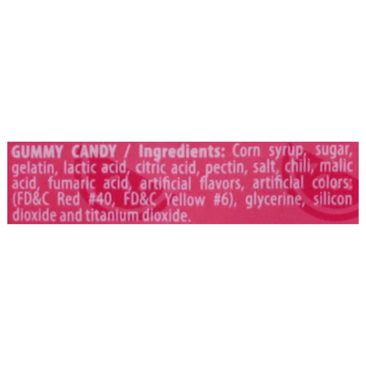 Corn Syrup, Sugar, Gelatin, Lactic Acid, Citric Acid, Pectin, Salt, Chili, Malic Acid, Fumaric Acid, Artificial Flavors, Artificial Colors: (FD&C Red #40, FD&C Yellow #6), Glycerine, Silicon Dioxide a…