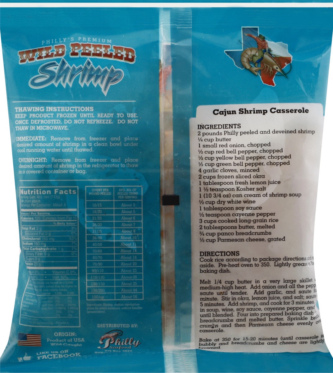Go Texan. Count per pound: 10/15; about 3 avg. no of peeled shrimp per serving. Count per pound: 16/20; about 5 avg. no of peeled shrimp per serving. Count per pound: 21/25; about 6 avg. no of peeled …