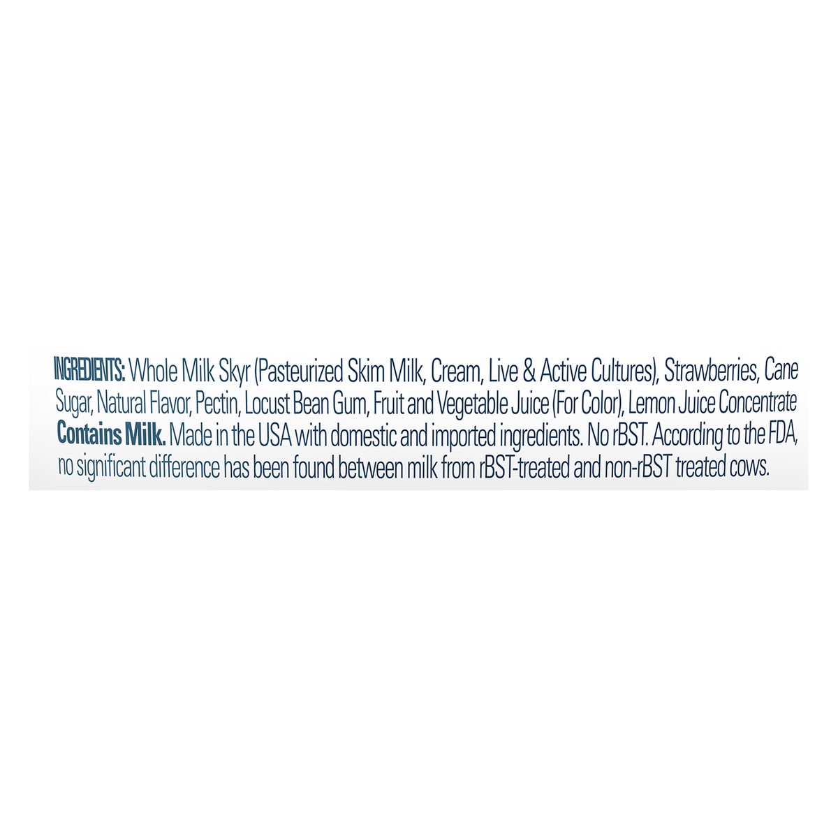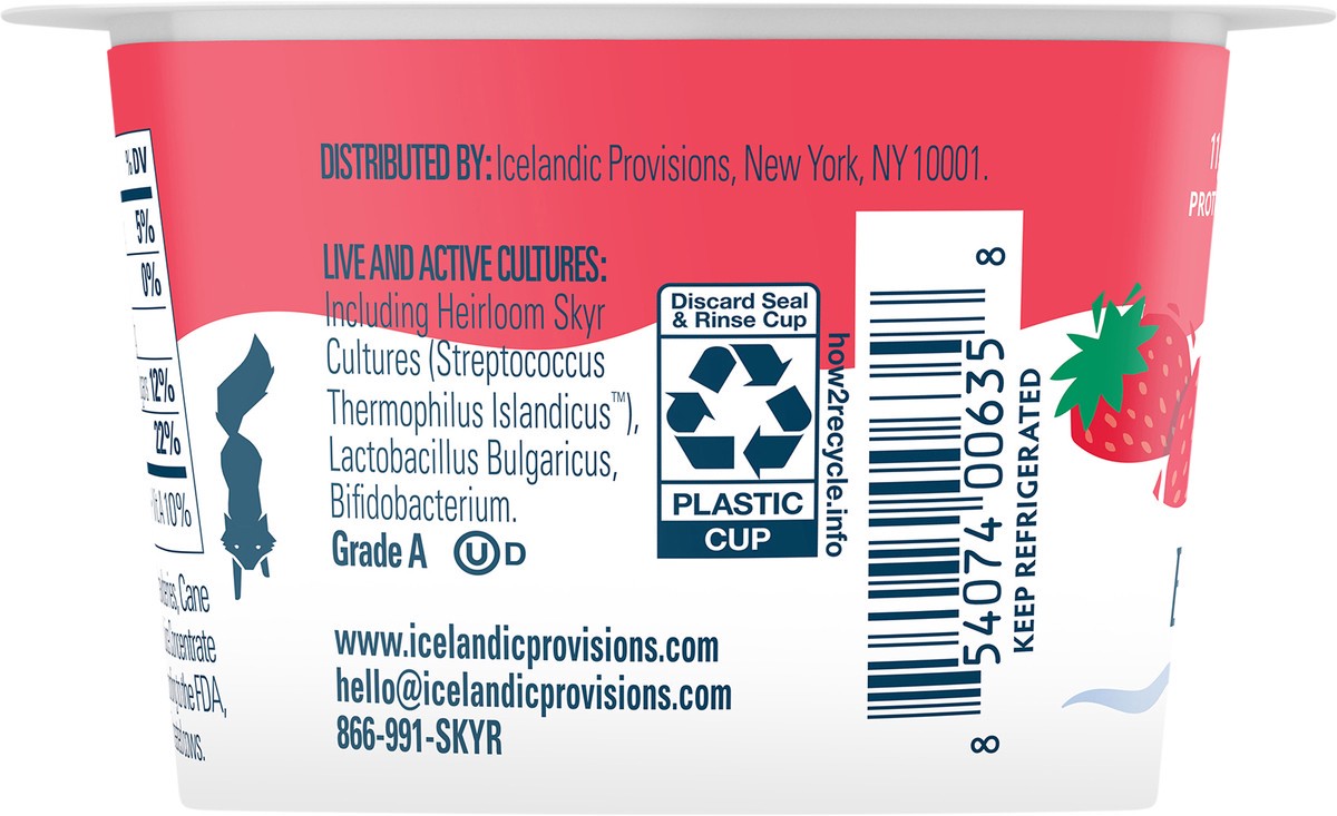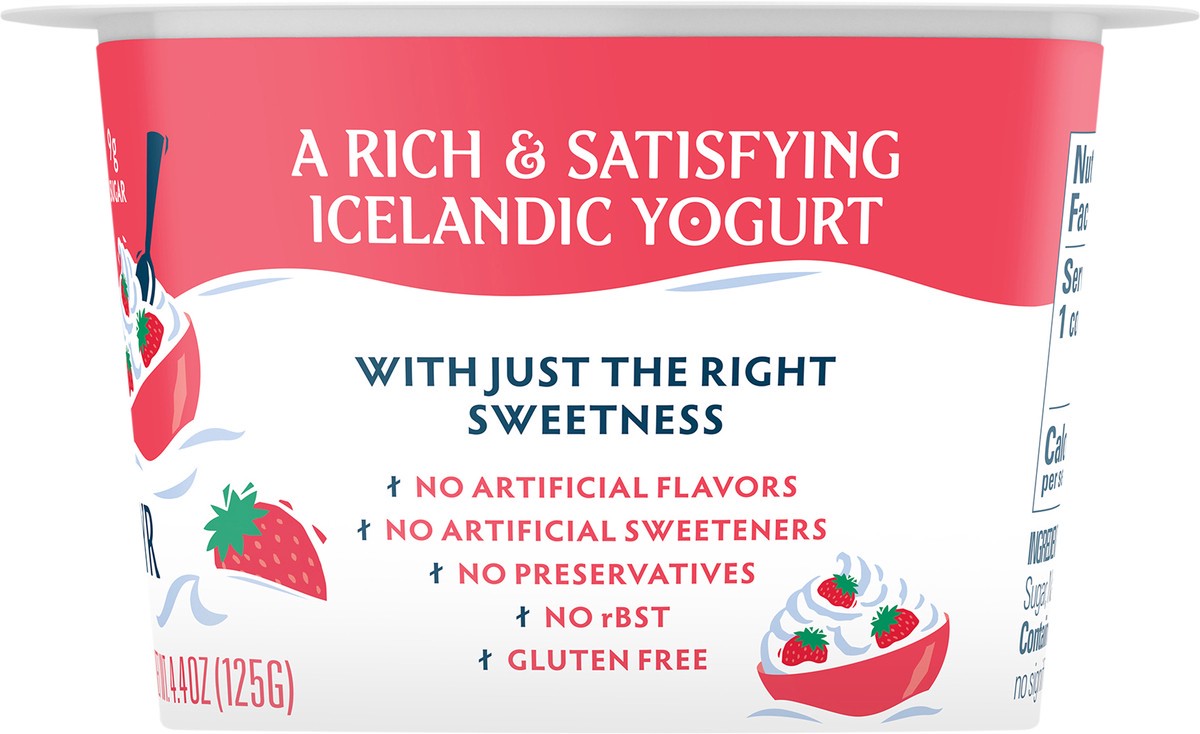 Whole Milk Skyr (Pasteurized Skim Milk, Cream, Live & Active Cultures), Strawberries, Cane Sugar, Natural Flavor, Pectin, Locust Bean Gum, Fruit and Vegetable Juice (for Color), Lemon Juice Concentrat…
