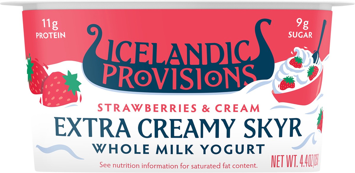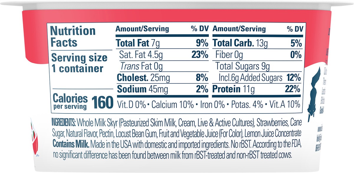 Whole milk yogurt. No artificial flavors. 11 g protein. 9 g sugar. Gluten free. See nutrition information for saturated fat content. Extra creamy skyr. No rBST. According to the FDA, no significant di…