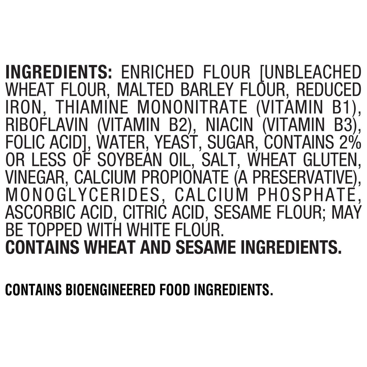Enriched Flour [Unbleached Wheat Flour, Malted Barley Flour, Reduced Iron, Thiamine Mononitrate (Vitamin B1), Riboflavin (Vitamin B2), Niacin (Vitamin B3), Folic Acid], Water, Yeast, Sugar, Contains 2…