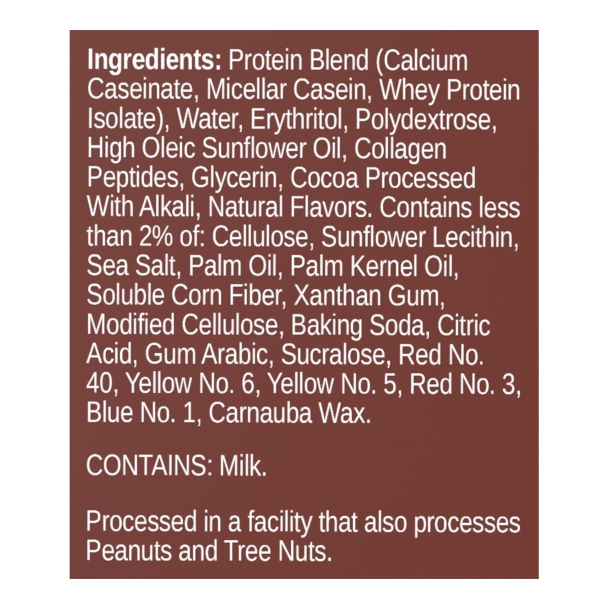 Protein Blend (Calcium Caseinate, Micellar Casein, Whey Protein Isolate), Water, Erythritol, Polydextrose, High Oleic Sunflower Oil, Collagen Peptides, Glycerin, Cocoa Processed with Alkali, Natural F…
